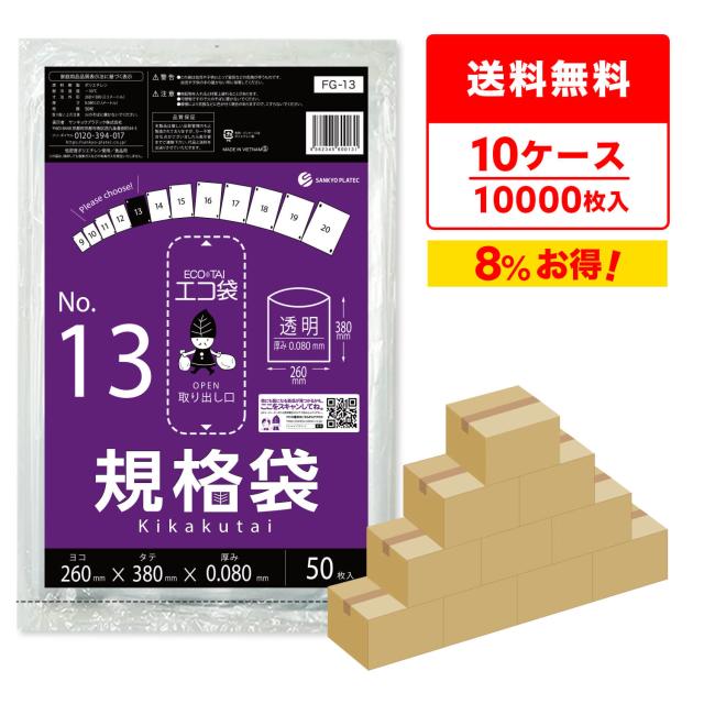 規格袋 13号 26x38cm 0.080mm厚 透明 50枚x20冊x10箱 FG-13-10 食品検査適合 ポリ袋 袋 平袋 保存袋 食品袋 梱包 No.13 クリア RoHS指定 サンキョウプラテック