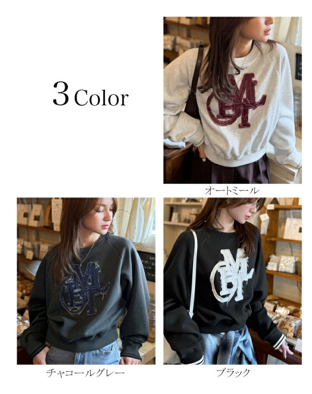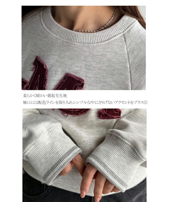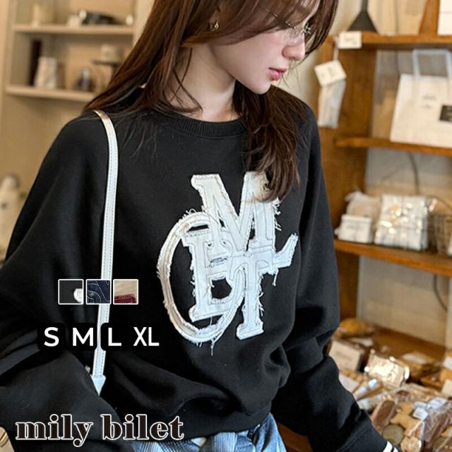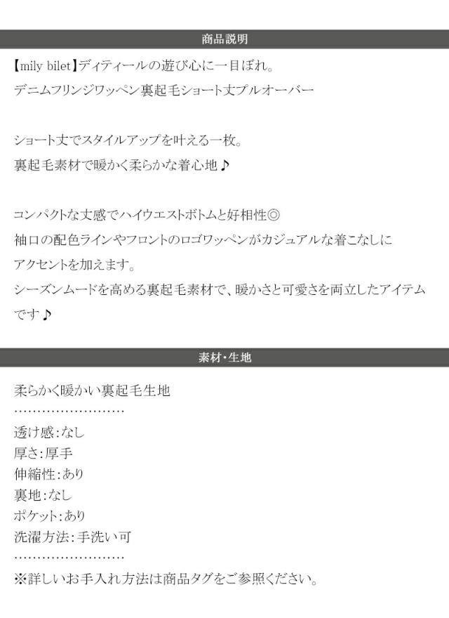 クラシカルエルフ冬新作 mily bilet スウェット レディース トップス デニム フリンジ ワッペン 裏起毛 ショート丈 プルオーバー 長袖 大きいサイズ 2025aw mi1329066