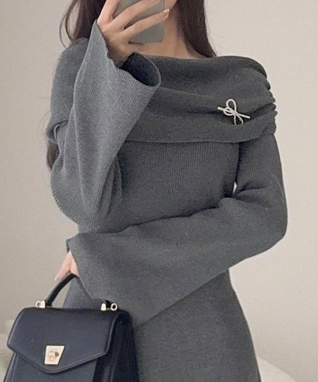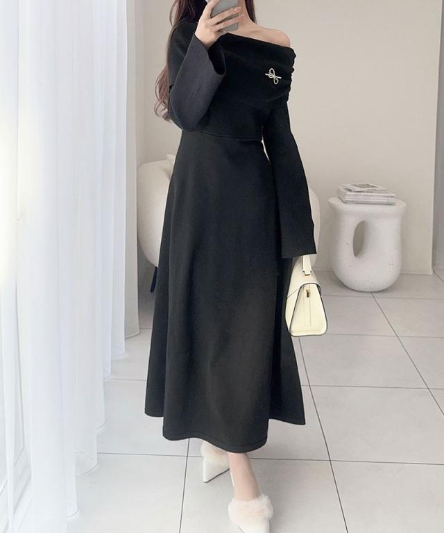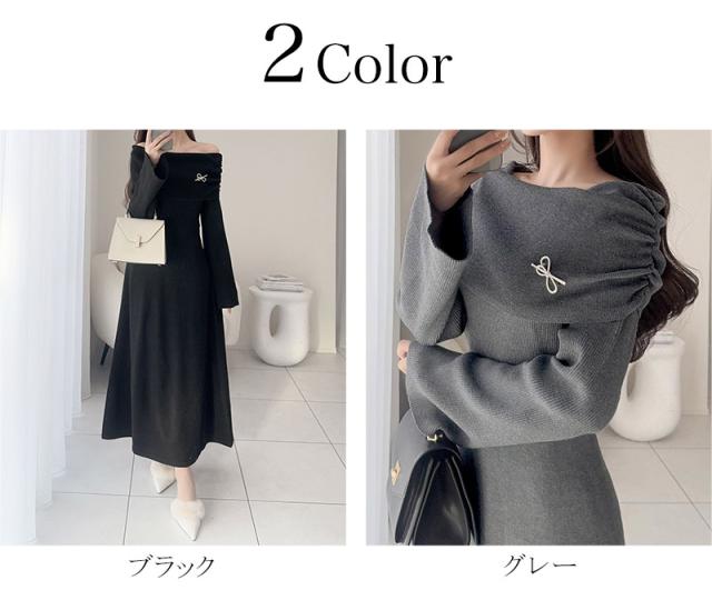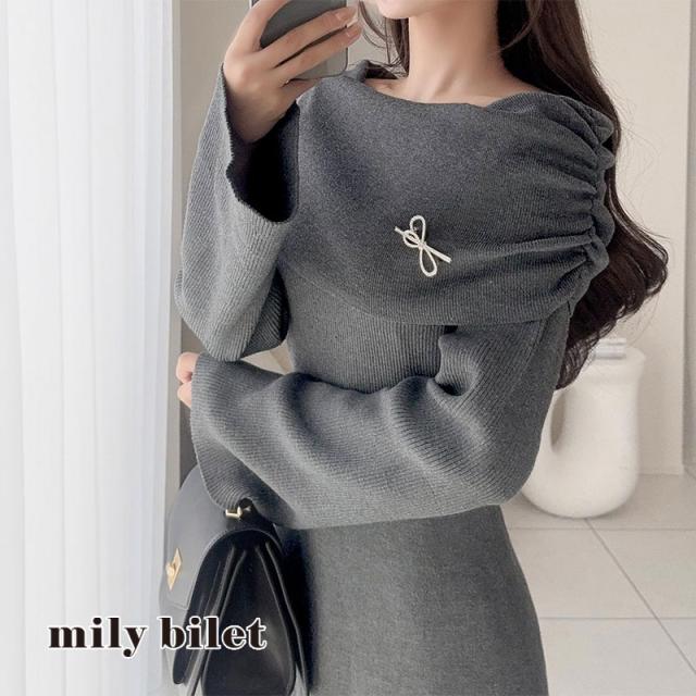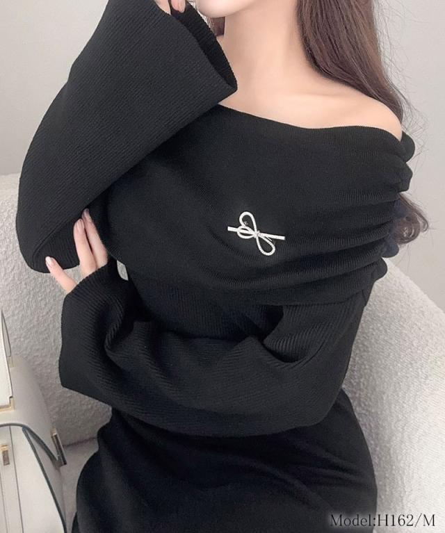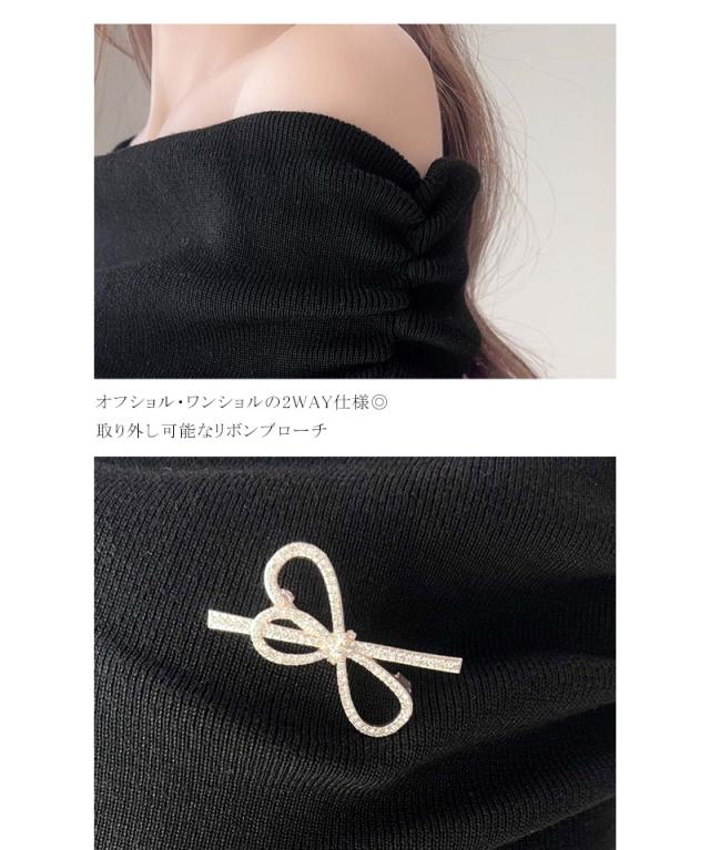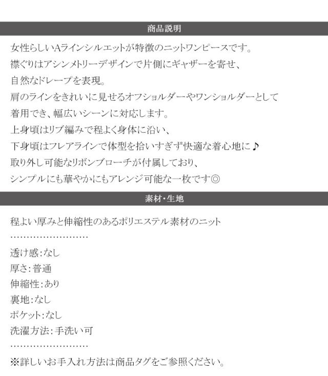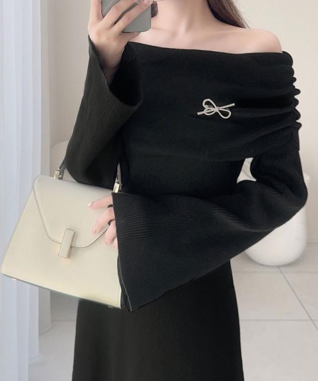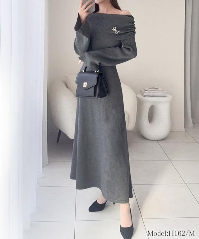 クラシカルエルフ新作 mily bilet ワンピース きれいめ レディース ボンブローチ付き オフショル マルチWAY ニット ロング フレア袖 ワンショルダー オフショルダー ドレープ感 ロングフレア Aライン シンプル 大きいサイズ 2025aw mi1359027