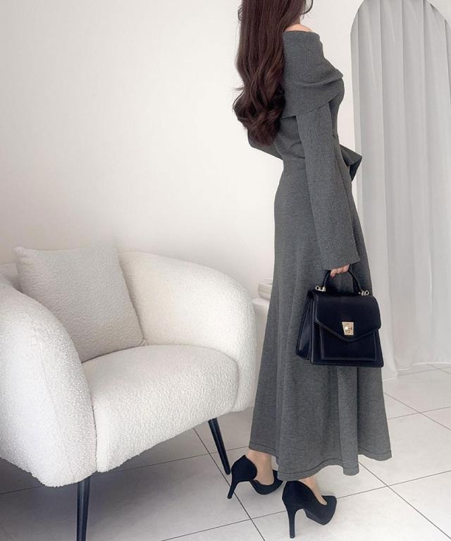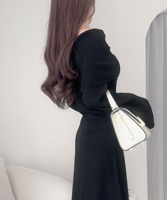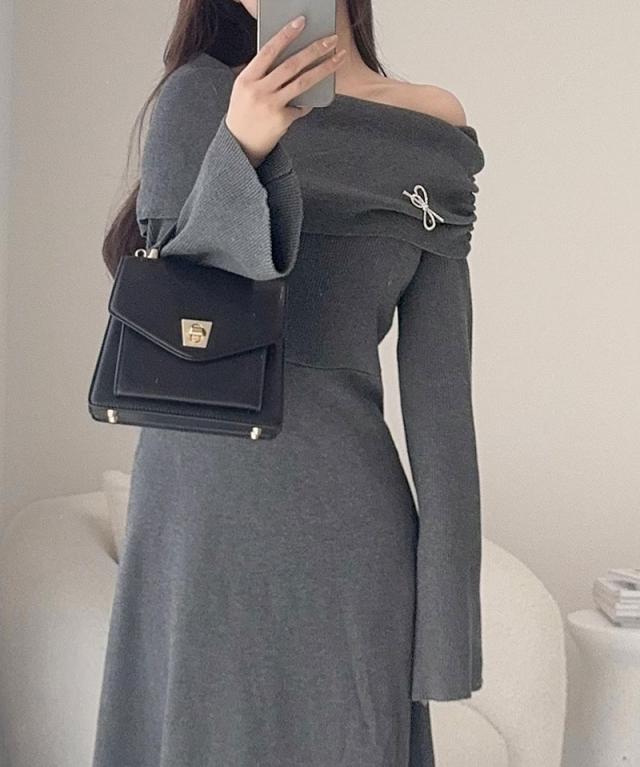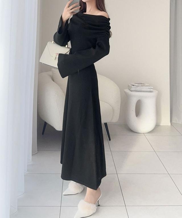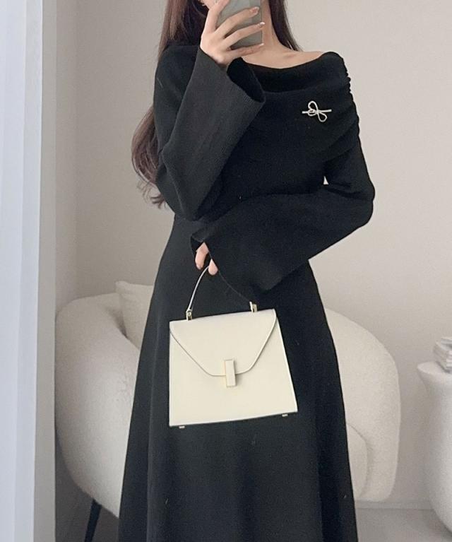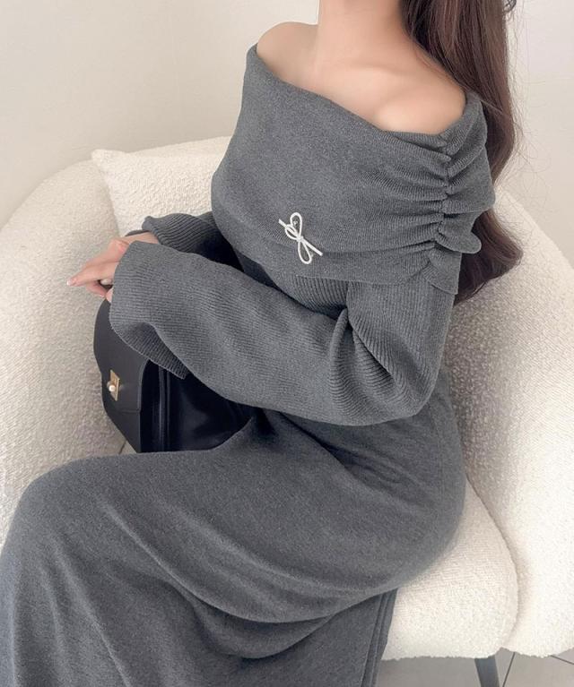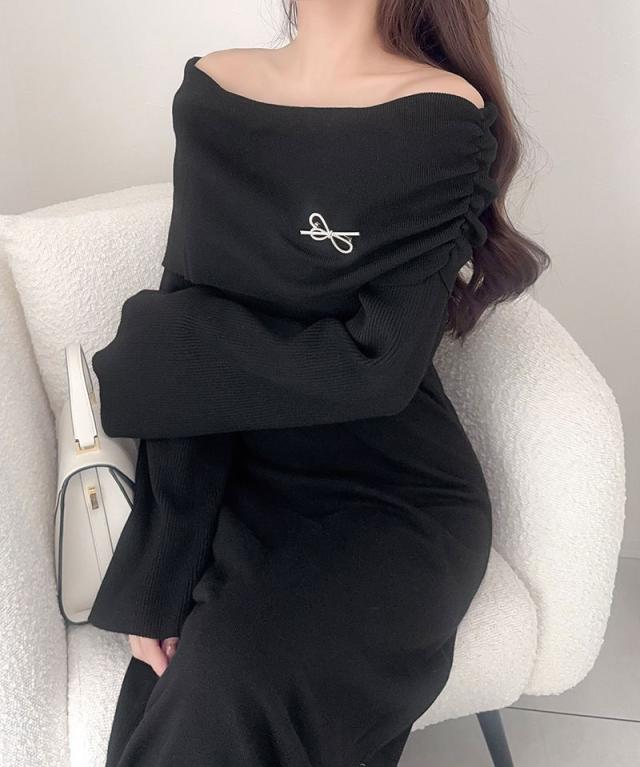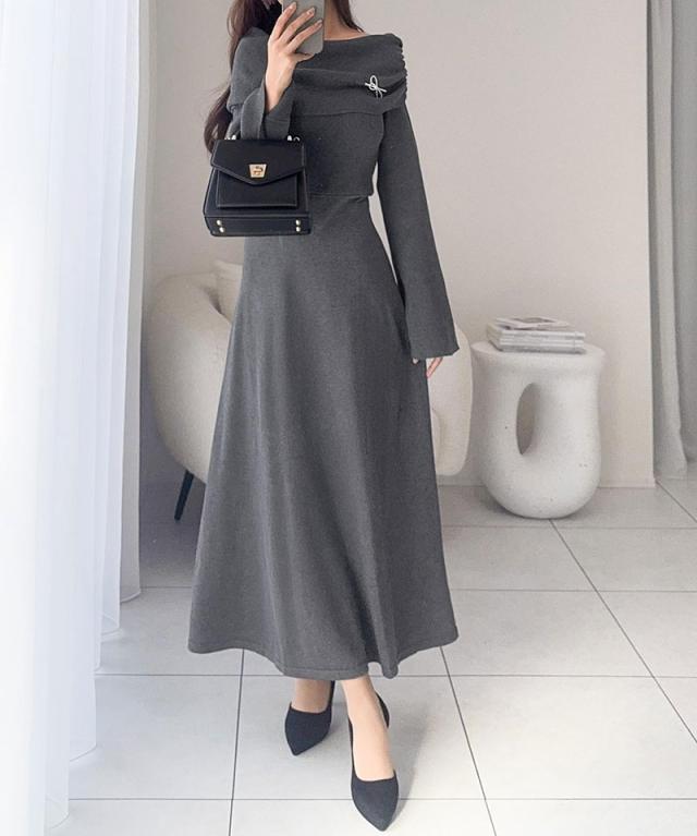 クラシカルエルフ新作 mily bilet ワンピース きれいめ レディース ボンブローチ付き オフショル マルチWAY ニット ロング フレア袖 ワンショルダー オフショルダー ドレープ感 ロングフレア Aライン シンプル 大きいサイズ 2025aw mi1359027