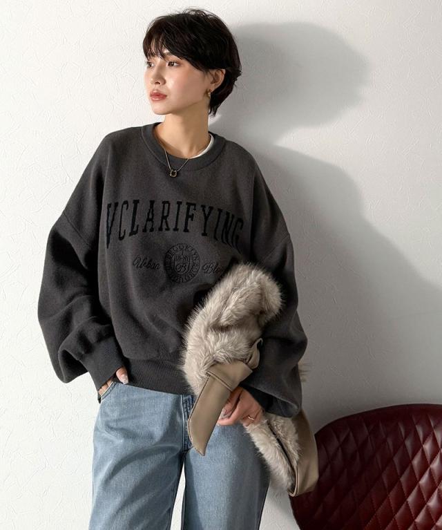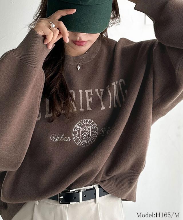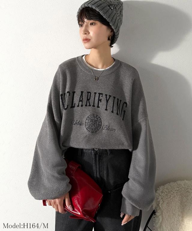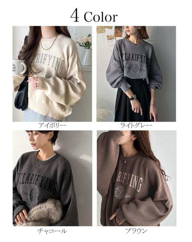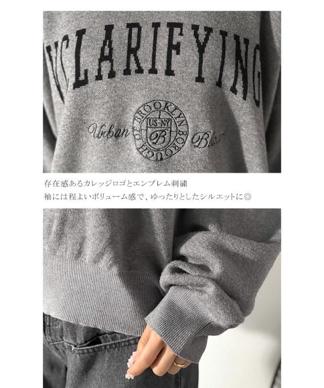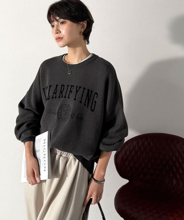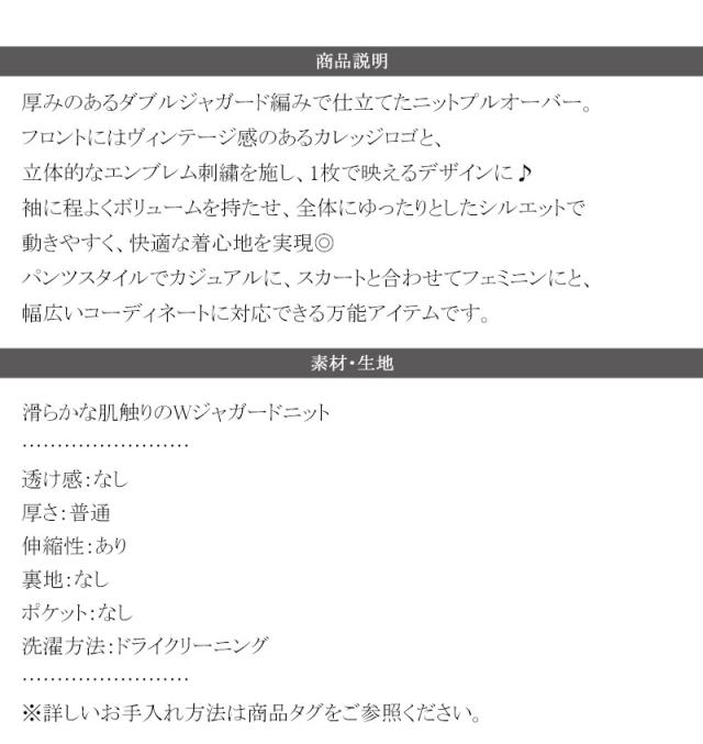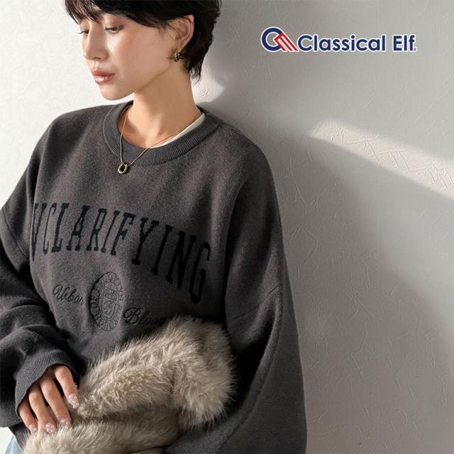 クラシカルエルフ冬新作 ニット レディース 長袖 トップス レディース プルオーバー ダブルジャガード 刺繍 カレッジロゴ ボリューム袖 ゆったり 大人カジュアル トレンド ヴィンテージ感 フェミニン 大きいサイズ 2025aw ce1260491