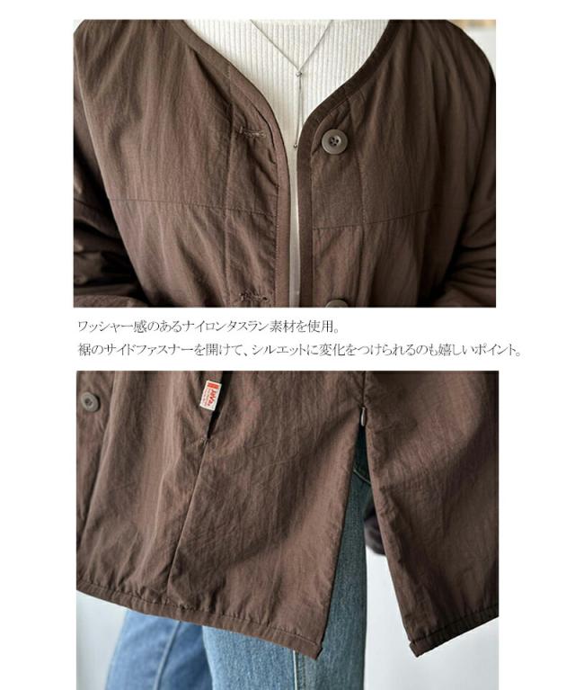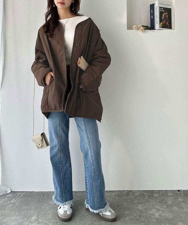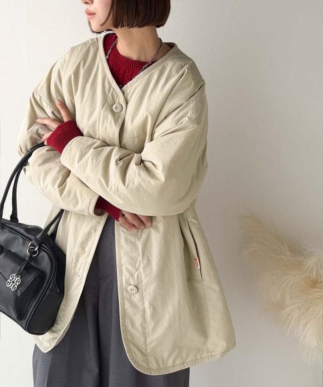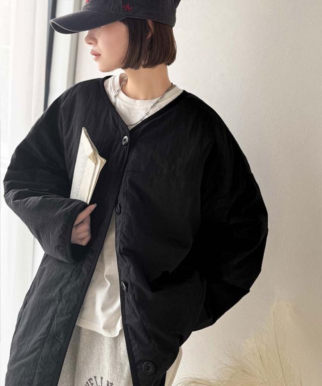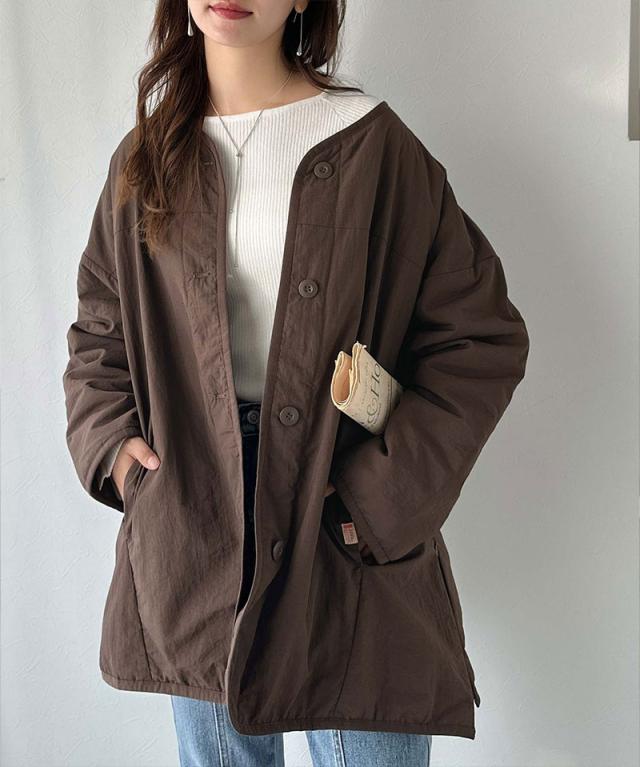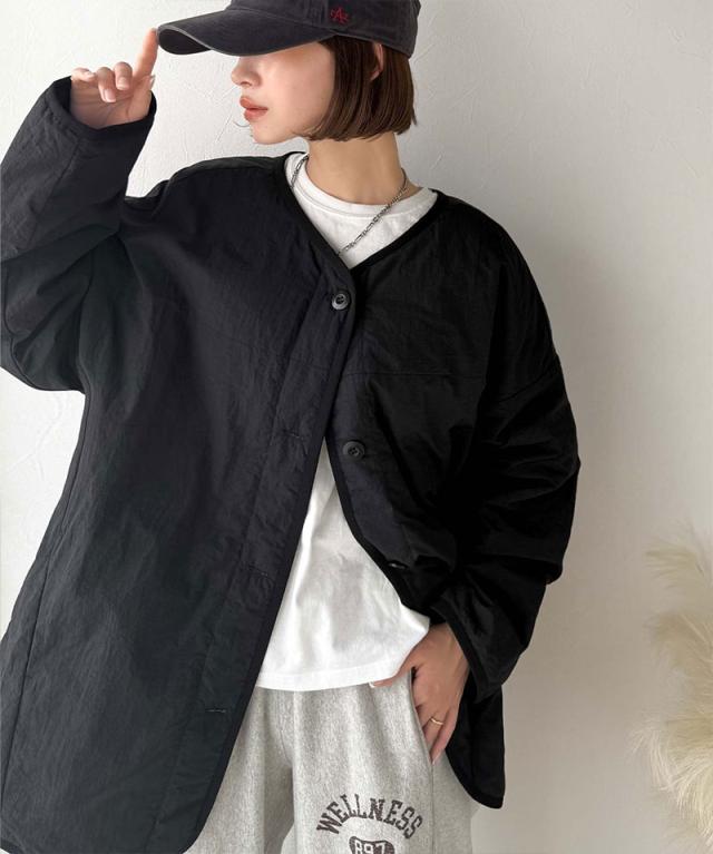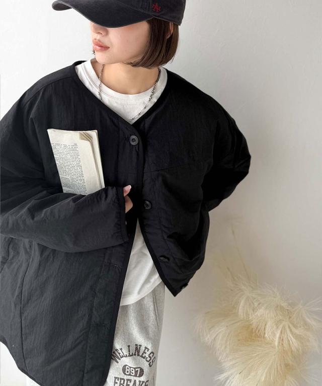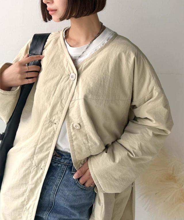 着るだけで今っぽく、かつシンプルに決まるノーカラー中綿ジャケット。