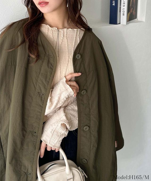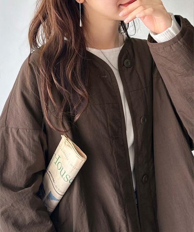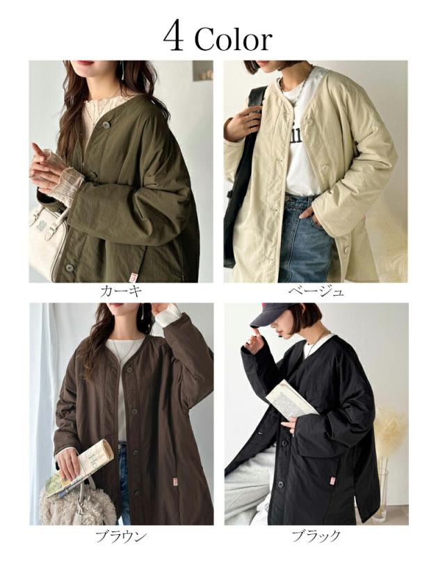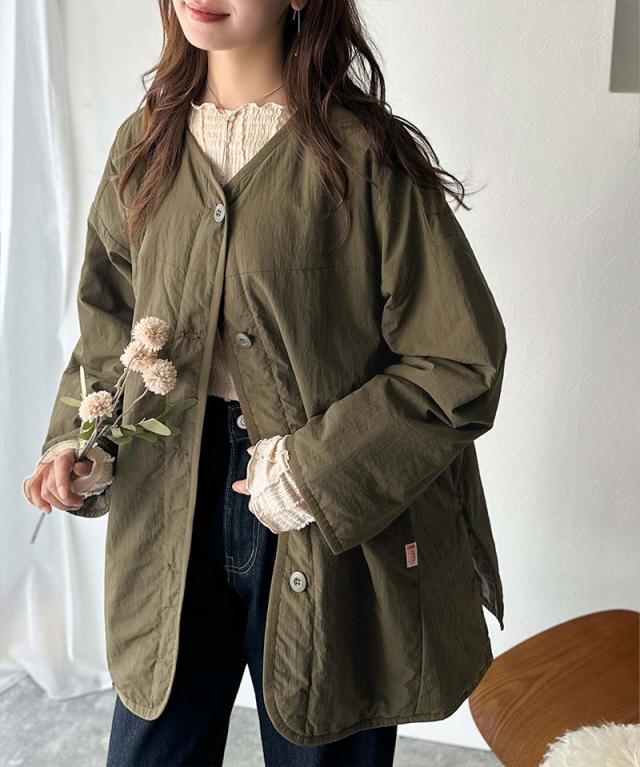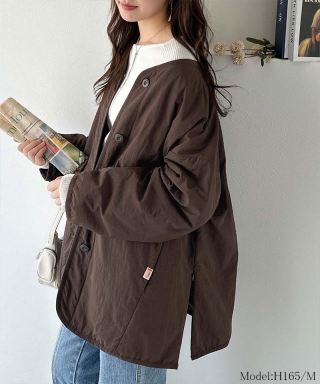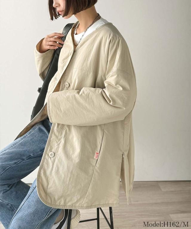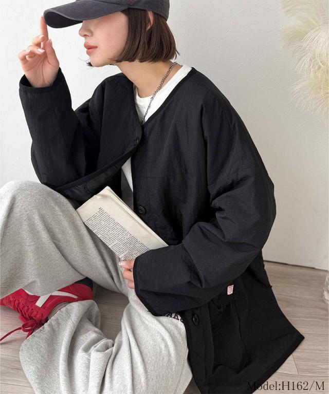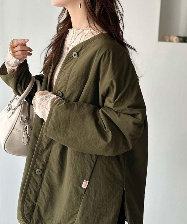 着るだけで今っぽく、かつシンプルに決まるノーカラー中綿ジャケット。