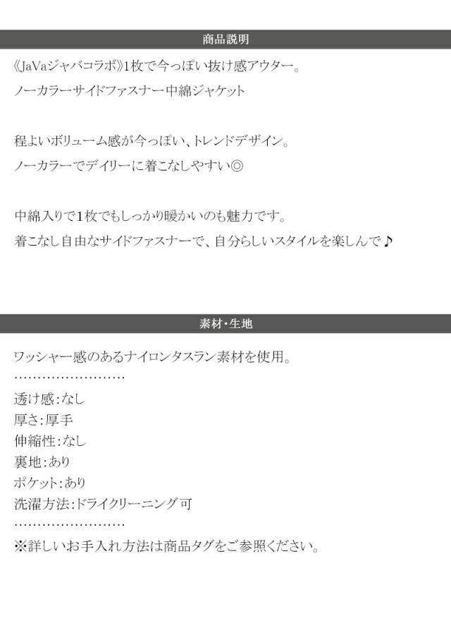 クラシカルエルフ冬新作 java ジャバコラボ アウター レディース 秋 ジャケット レディース 抜け感 ノーカラー サイド ファスナー 中綿 JK 大きいサイズ 2025aw jv1265013