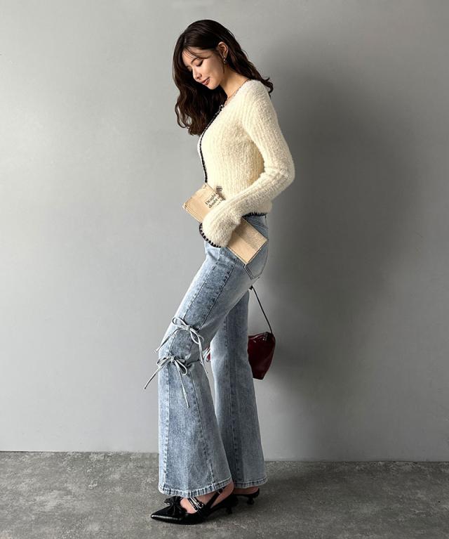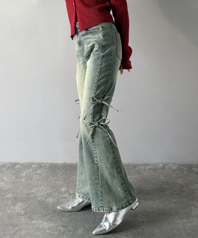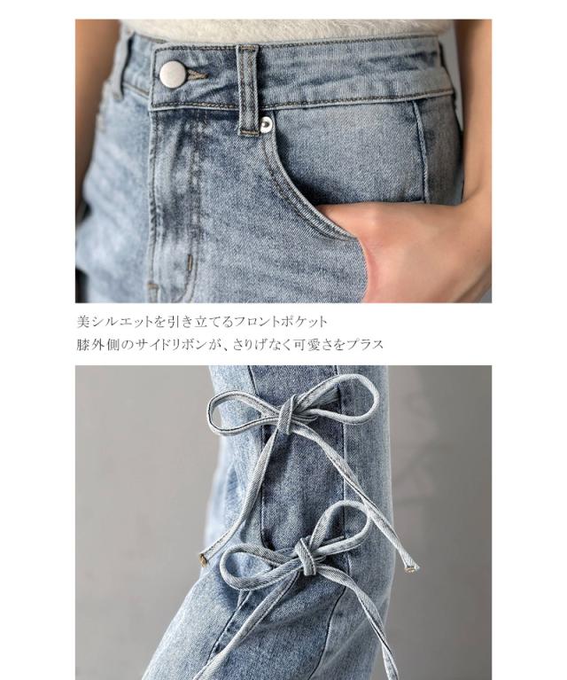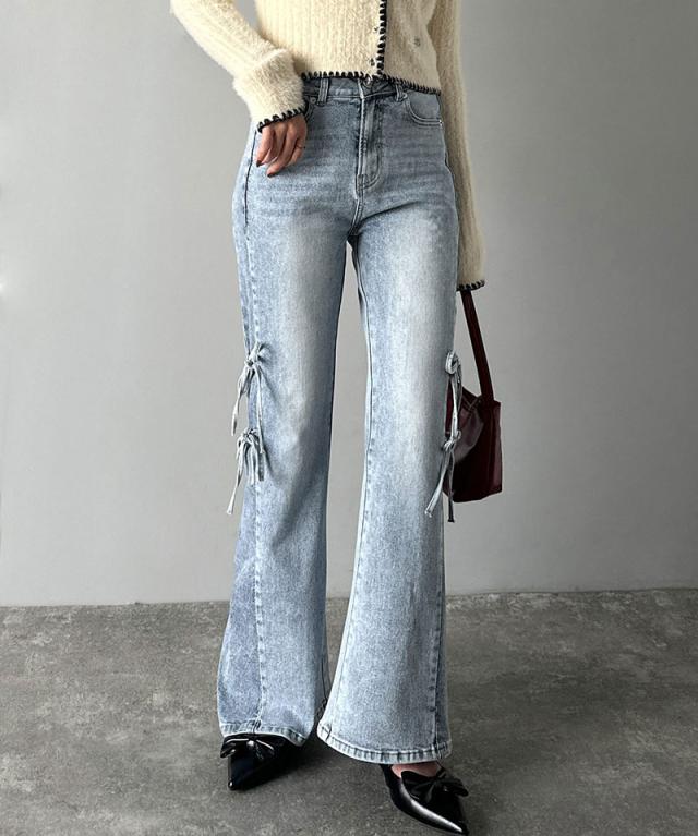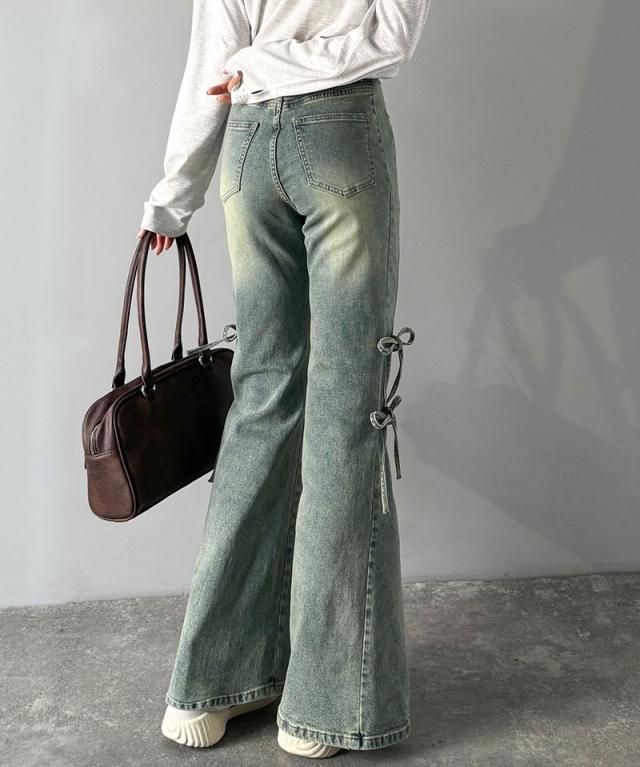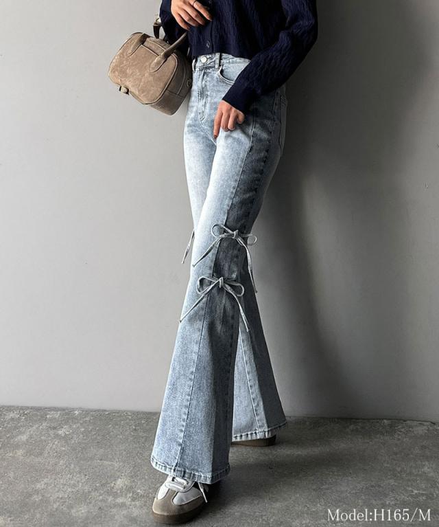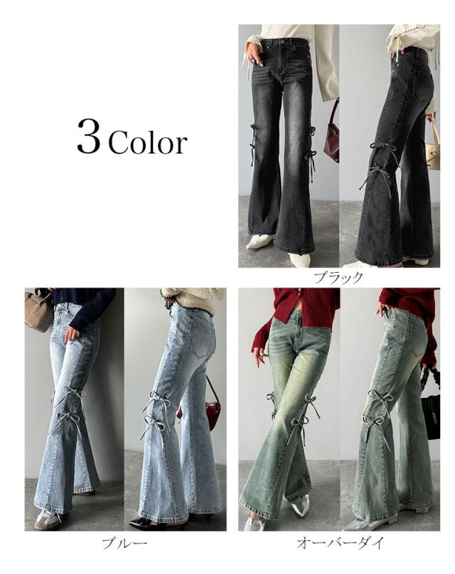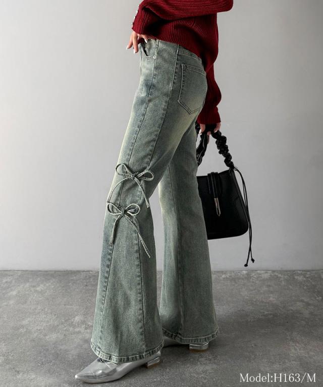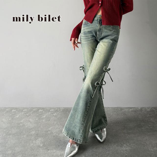 クラシカルエルフ冬新作 mily bilet ボトムス レディース デニムパンツ レディース 大きいサイズ ストレッチ フリンジフレア 美脚効果 上品 リボン 快適 ストレッチ素材 トレンド感 カジュアル フォーマル オールシーズン ガーリー 2025aw mi0909015
