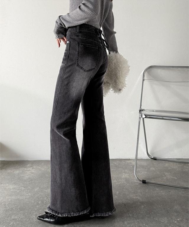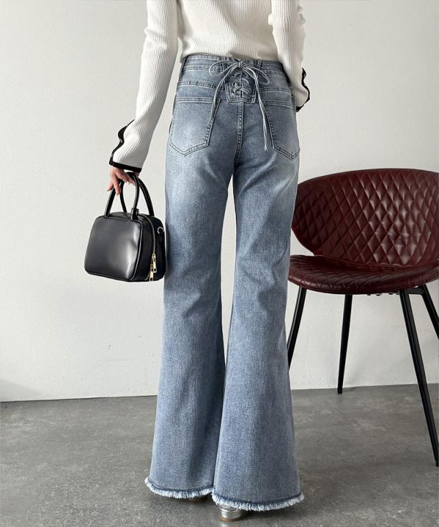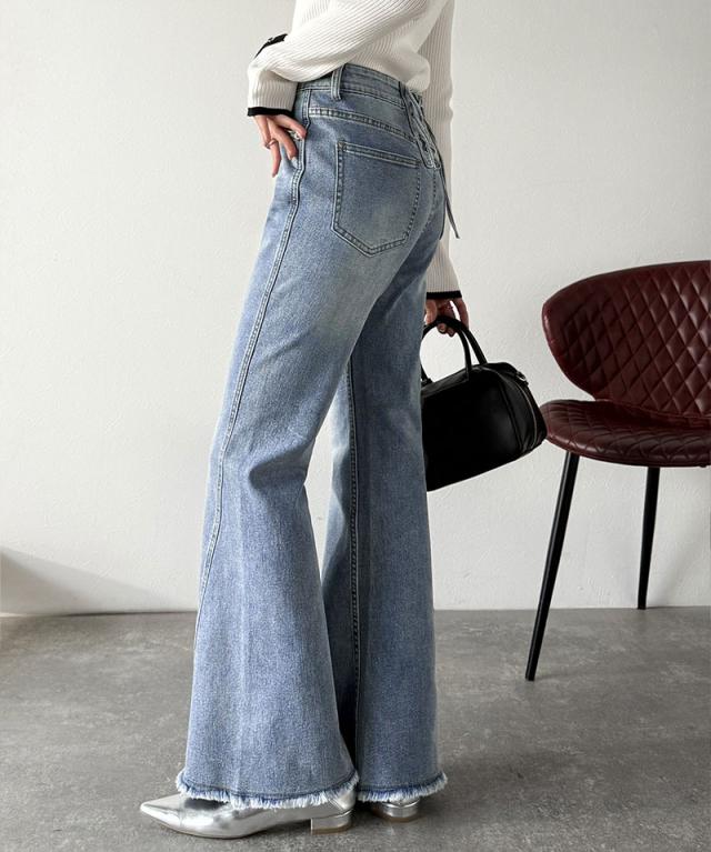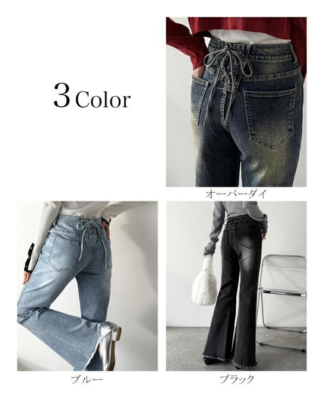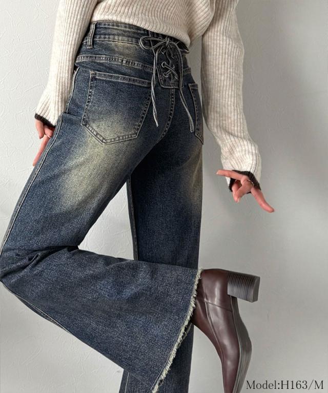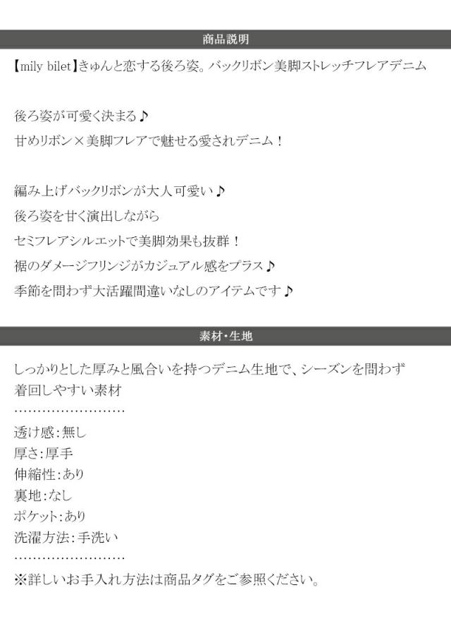 クラシカルエルフ冬新作 mily bilet ボトムス レディース パンツ レディース バック リボン 美脚見え ストレッチ フレア デニム 裾 ダメージ フリンジ 大きいサイズ 2025aw mi0909016