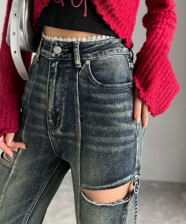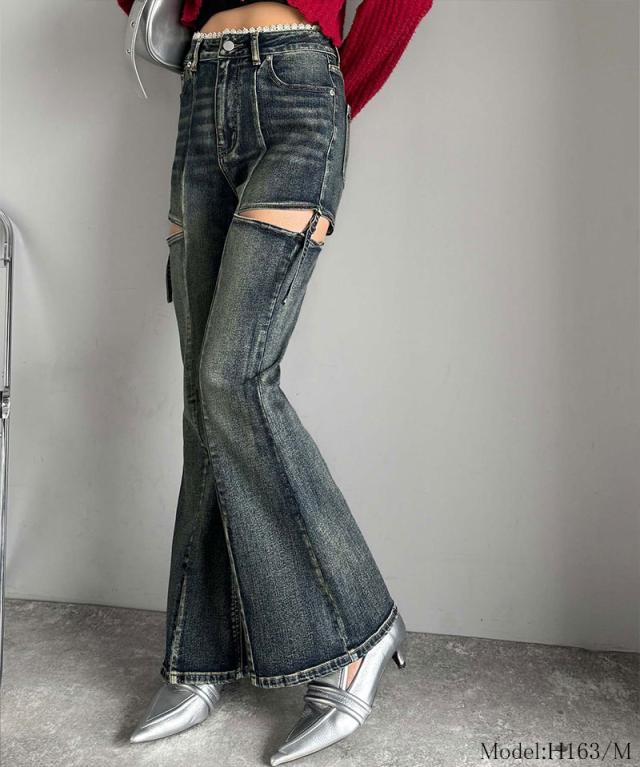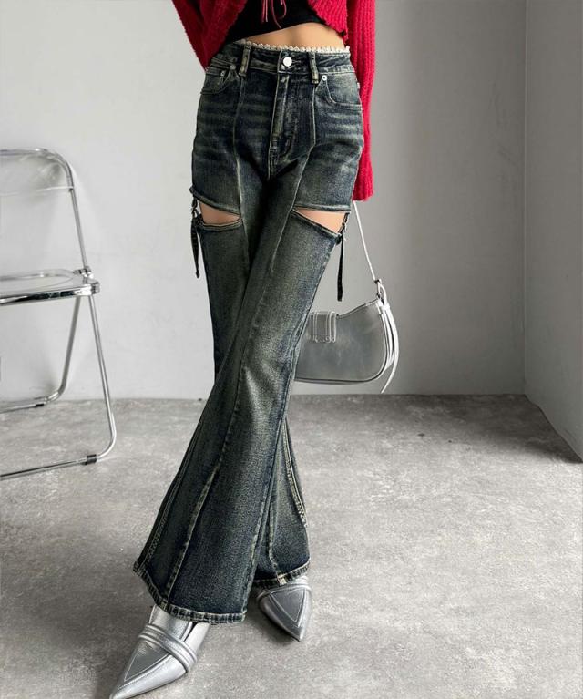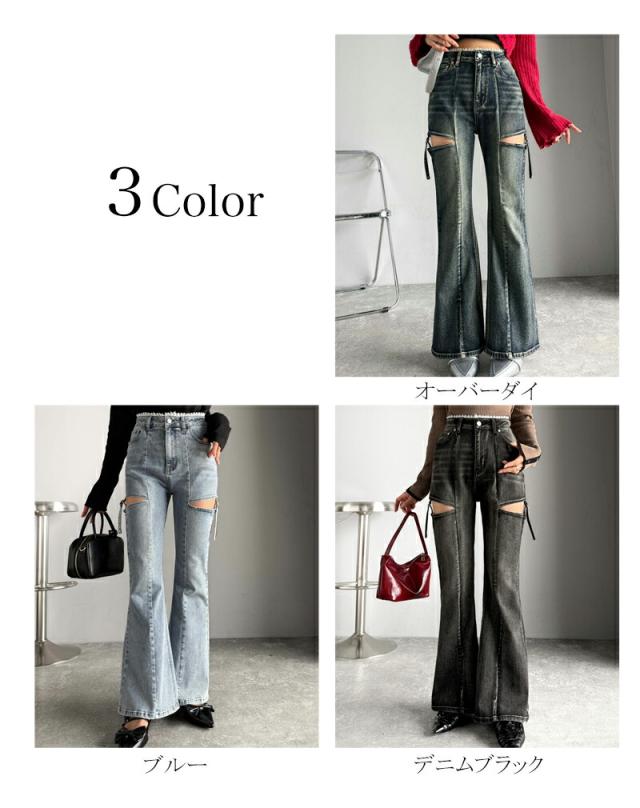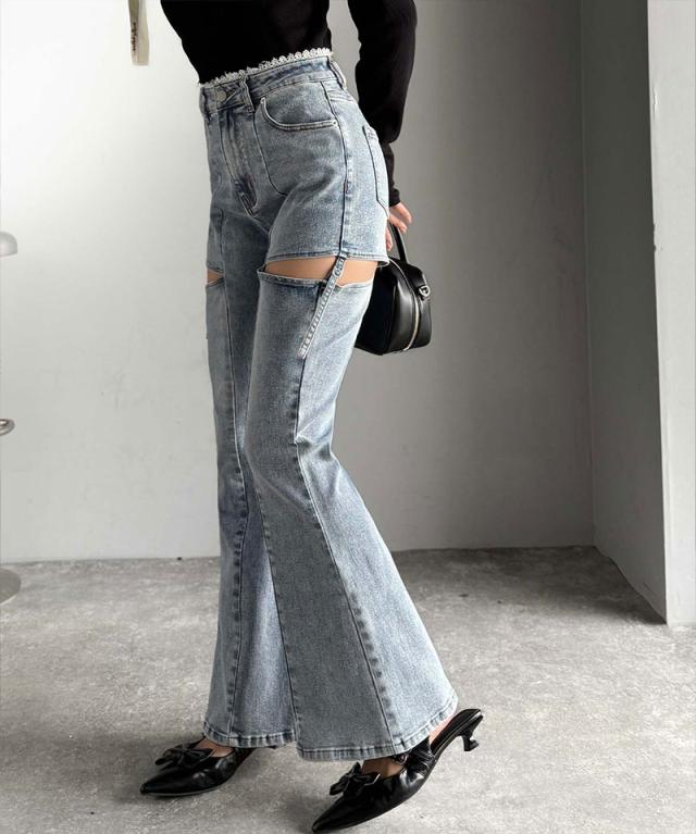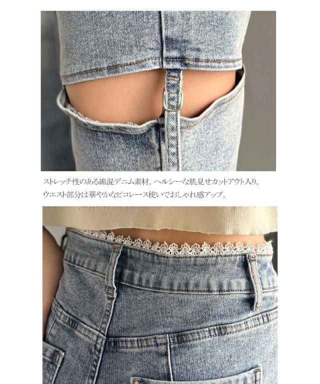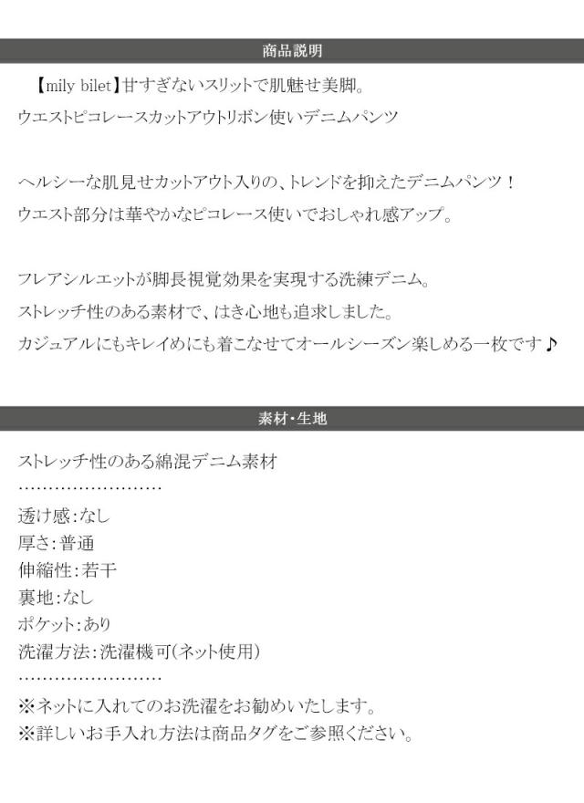 クラシカルエルフ冬新作 mily bilet ボトムス レディース パンツ レディース 肌見せ スリット ウエスト ピコレース カット アウト リボン 使い ストレッチ デニム 大きいサイズ 2025aw mi0909018