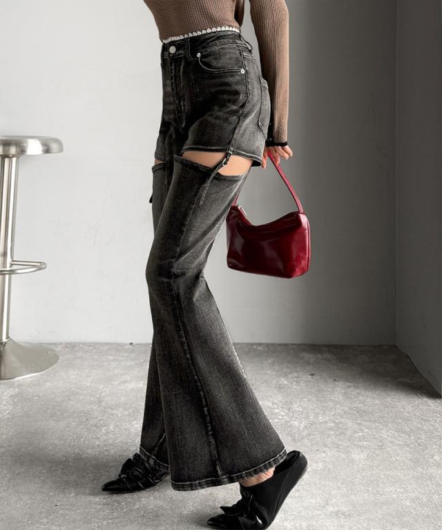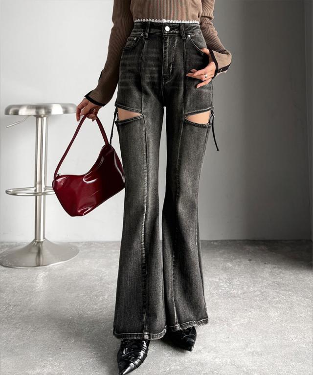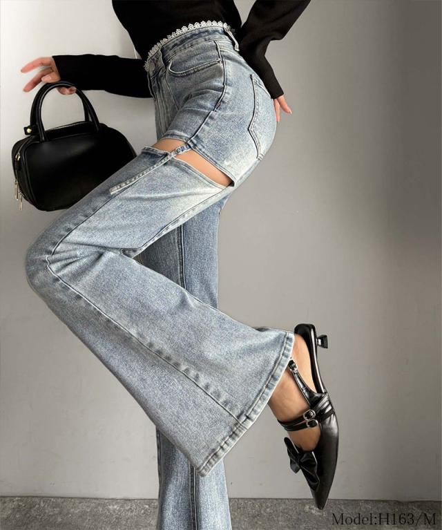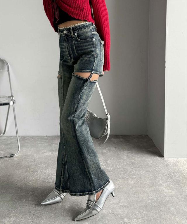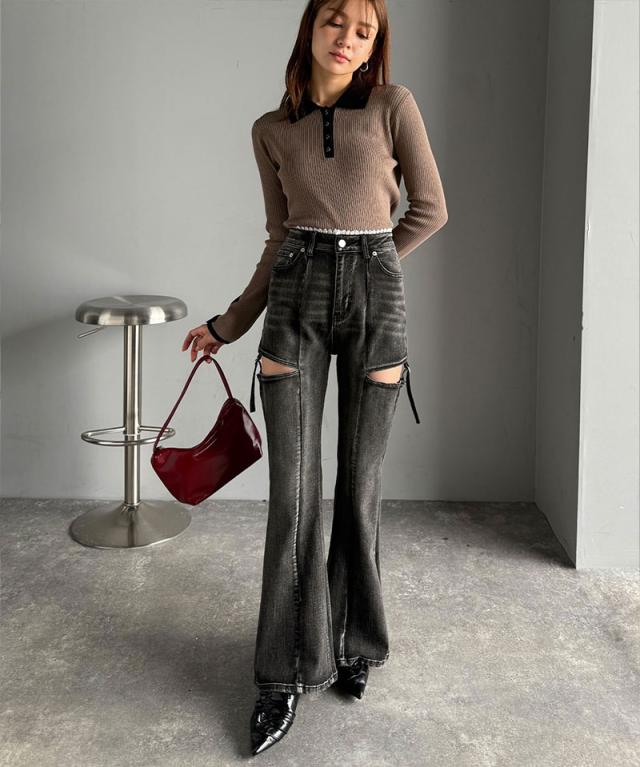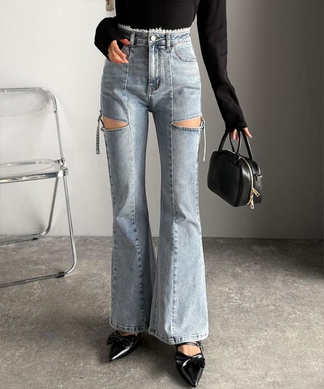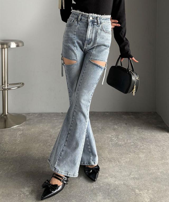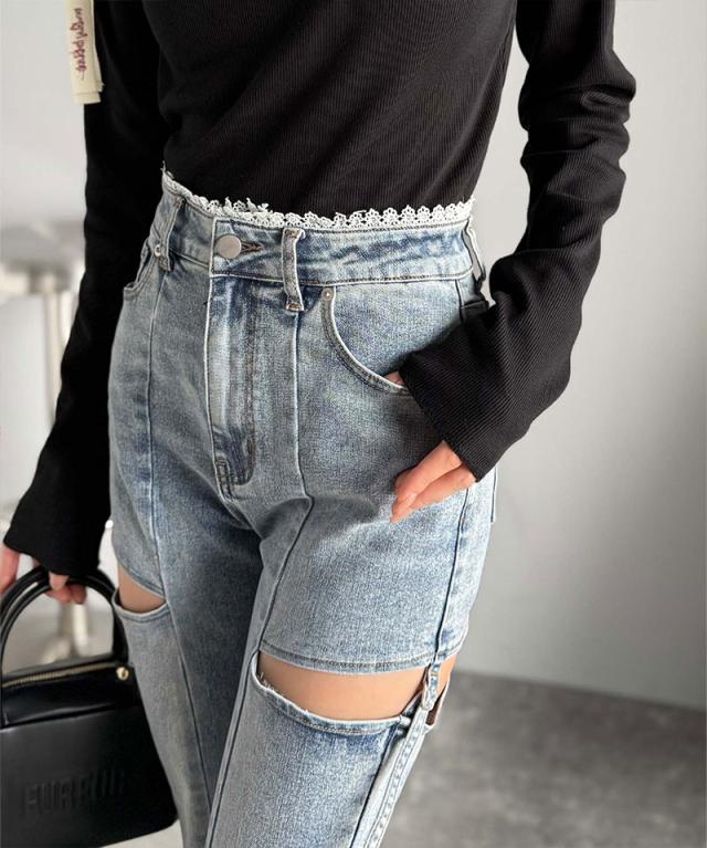 クラシカルエルフ冬新作 mily bilet ボトムス レディース パンツ レディース 肌見せ スリット ウエスト ピコレース カット アウト リボン 使い ストレッチ デニム 大きいサイズ 2025aw mi0909018