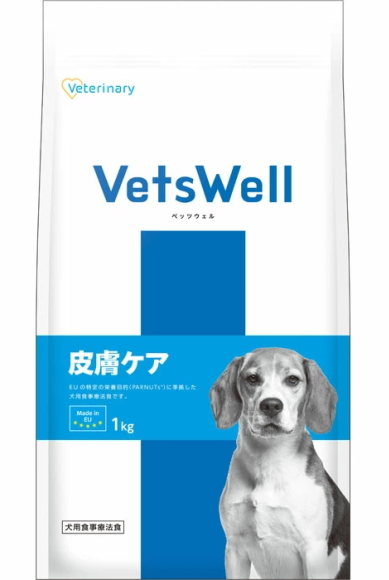 4973321000058「VetsWell 皮膚ケア」は犬の皮膚疾患に配慮し、特別に調製された食事療法食です。この食事は、健康な皮膚と被毛を維持するため、オメガ3系脂肪酸とオメガ6系脂肪酸を調整※1し、さらに抗酸化物質の配合※2により、健康的な皮膚を保ちます。また消化性の高いタンパク源として白身魚※3を使用し、消化管の健康維持に配慮しています。他にも健康的な腸内フローラを保つためフラクトオリゴ糖、ビートパルプやサツマイモを配合しています。※1 EPA+DHA:約0.5%、リノール酸:約3.91%(サーモンオイル・乾燥藻類・亜麻仁由来)、※2 亜麻仁由来、※3タンパク質の消化率90%以上