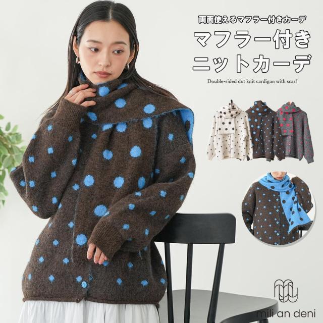 春新作 マフラー付きドットニットカーディガン リバーシブルマフラー ドット 水玉 ウール混 M トップス 春夏 レディース ミリアンデニ メール便(ネコポス) tc61112