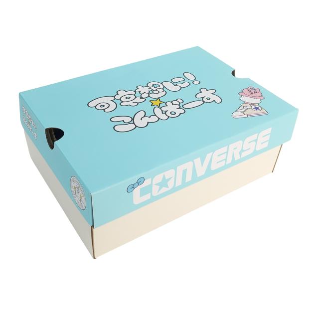 描きおろしのロゴを使用したインソール、キャラクターとオールスターが組み合わさった描きおろしのイラストが入ったオリジナルカートンを採用。