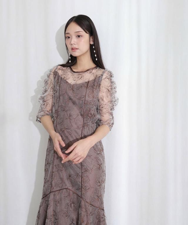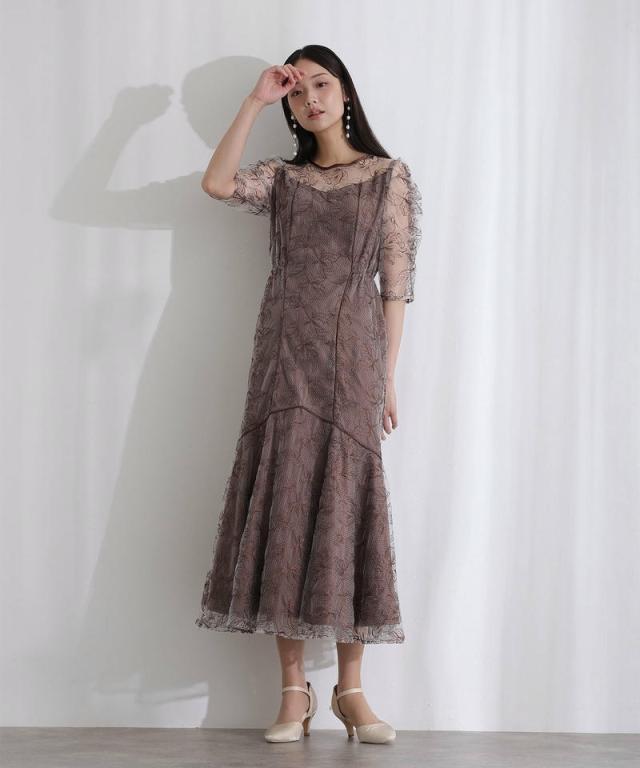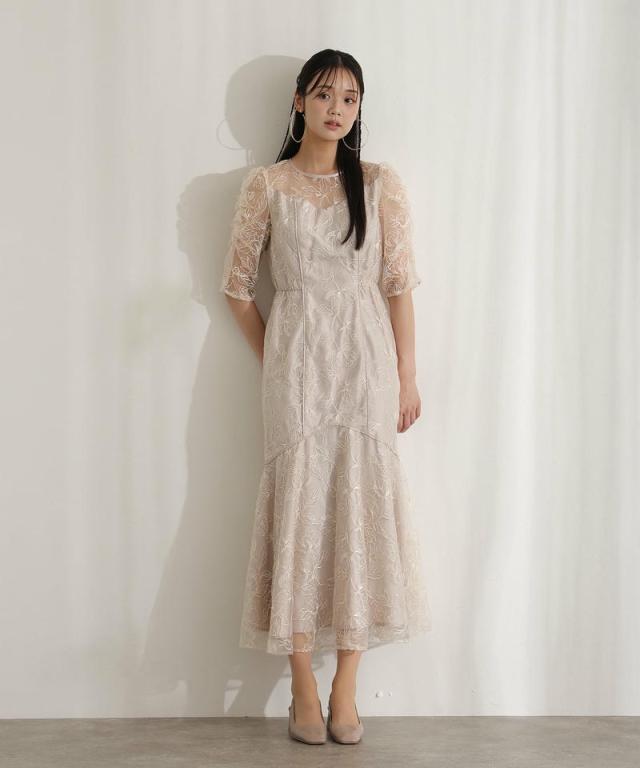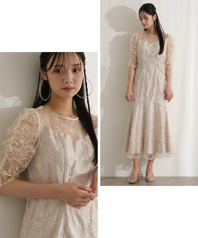 繊細な刺繍チュールを贅沢にあしらった、上品でフェミニンなロングドレス。