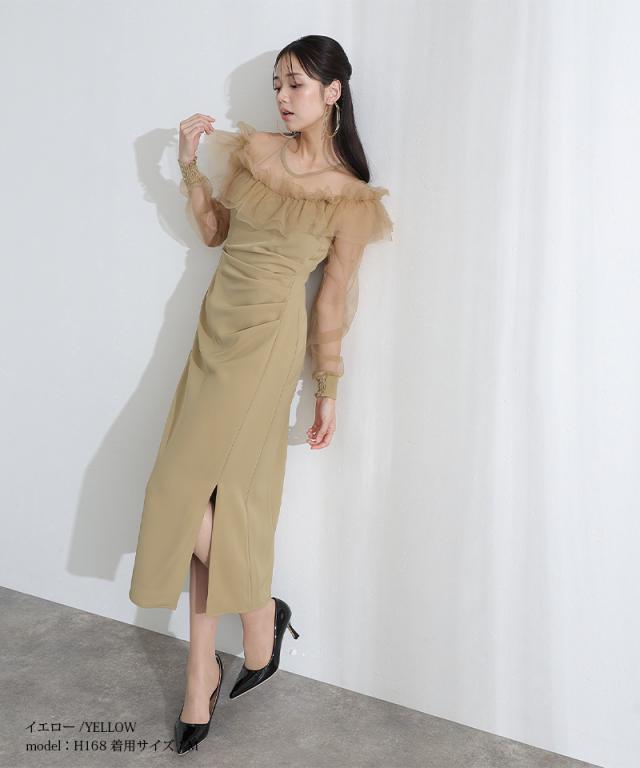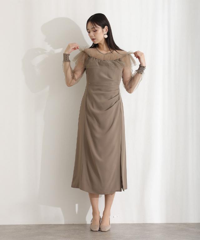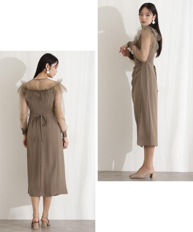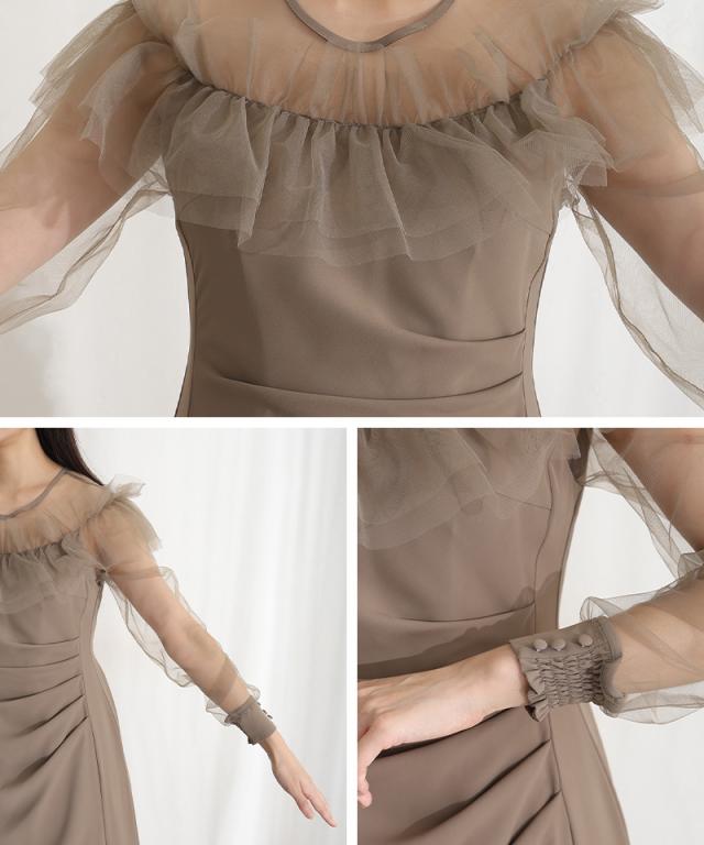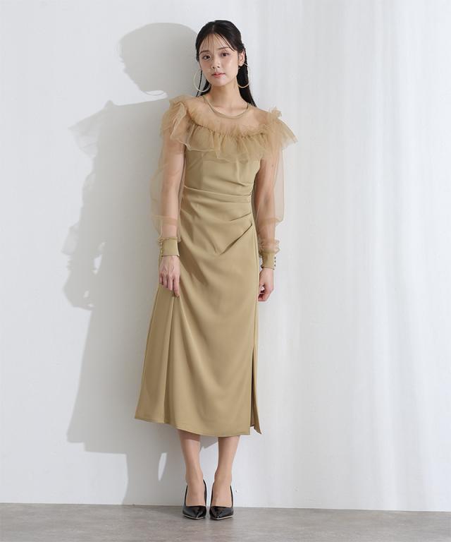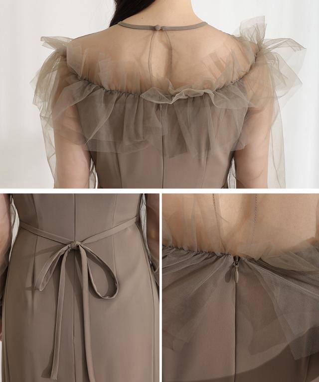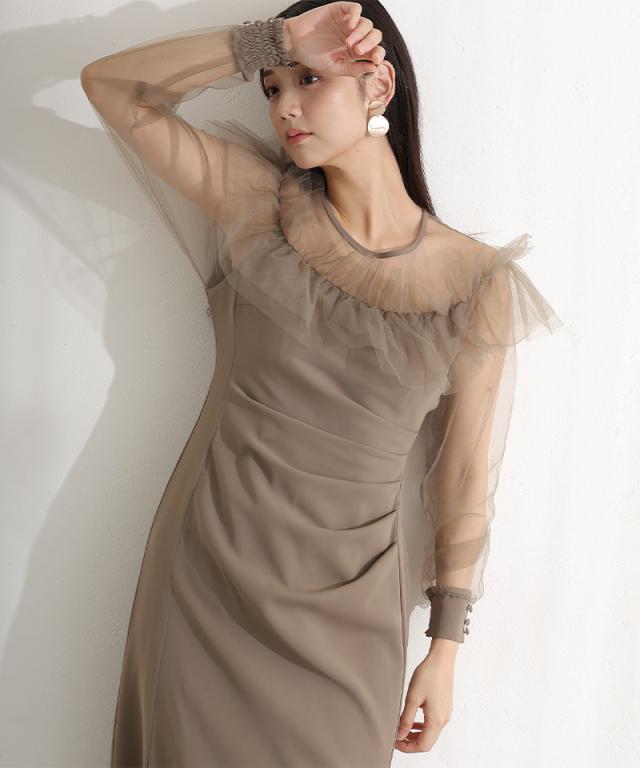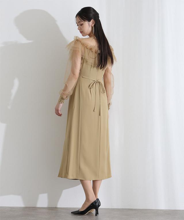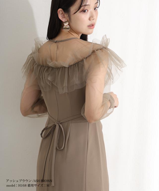 デコルテを華やかに彩るラッフルとシアー素材が女性らしさを引き立てるドレス。
