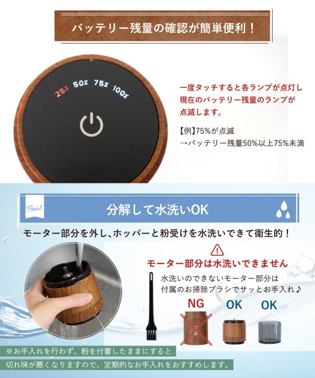 ※動作が途中停止する場合、ホッパー内部で目詰まりの可能性があります。次のことをお試しください。【本体を軽く振って再稼働】【ホッパーの掃除(ブラシや水洗い)】【3分連続モードの使用】=電源パネルの2度目のタップを離さず維持〜数字点滅後に指を離す