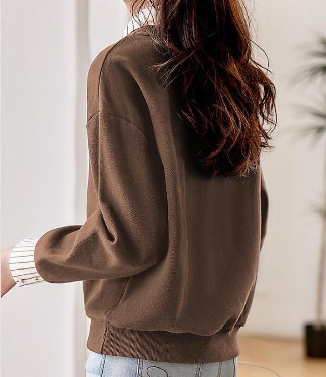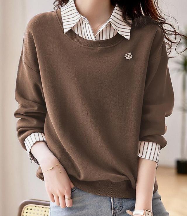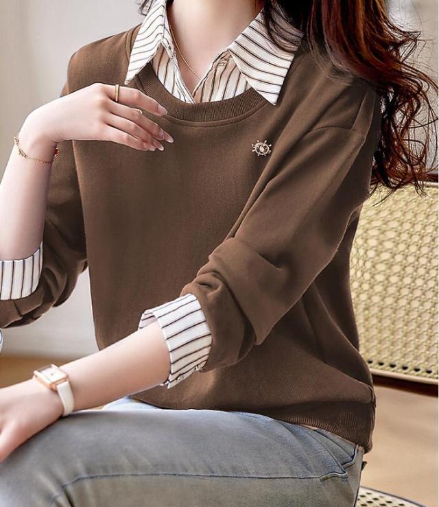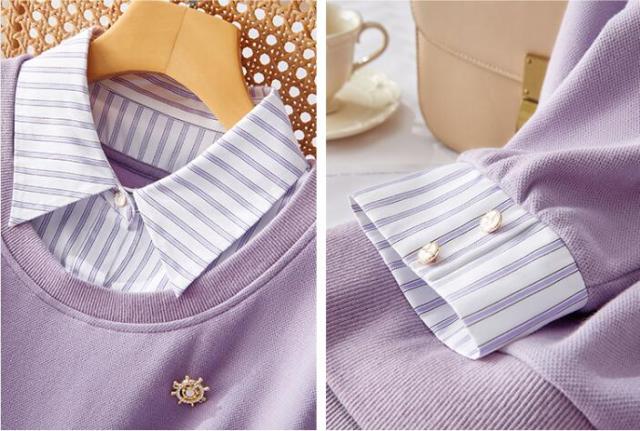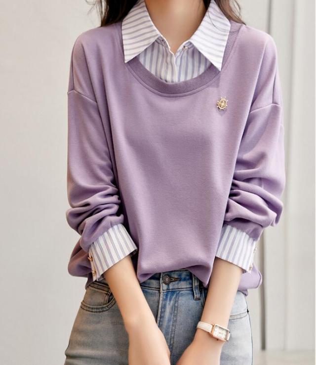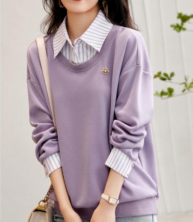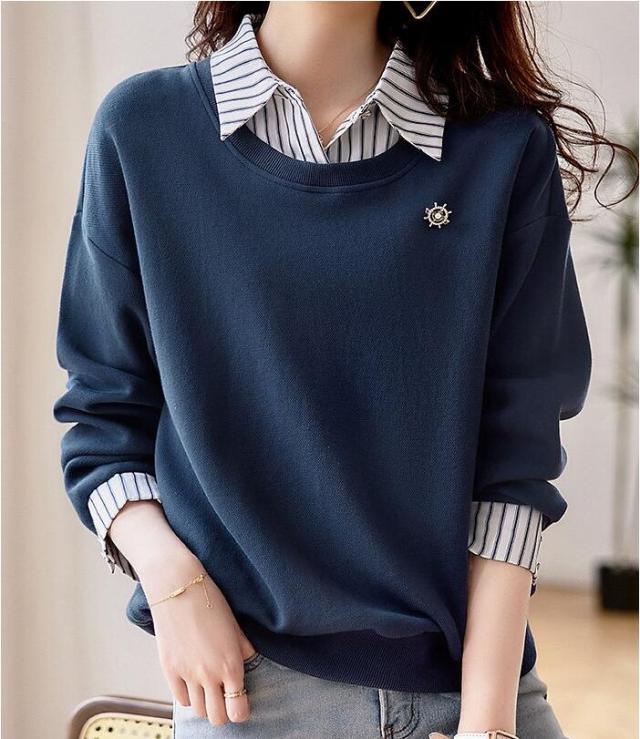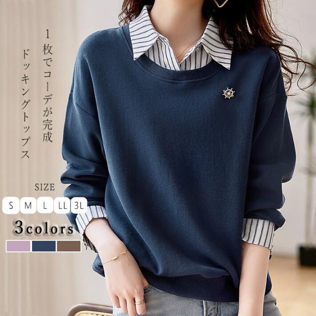 トップス 切替え トレーナー スウェット プルオーバー コットン レディース レイヤード風 ドッキング 付け襟 長袖 ストライプ ゆったり カジュアル 無地 春 秋 冬 S M L 2L 3L