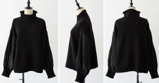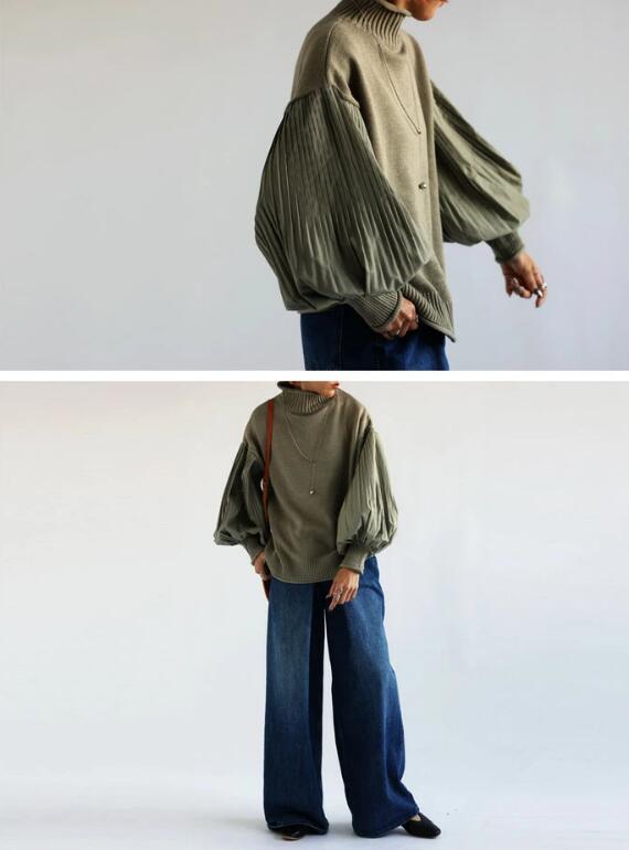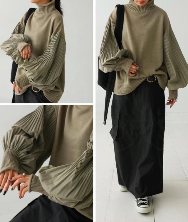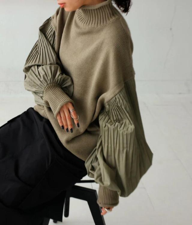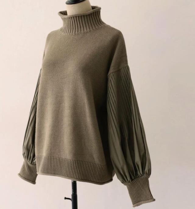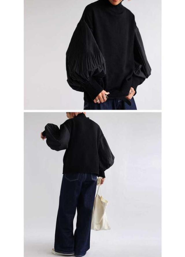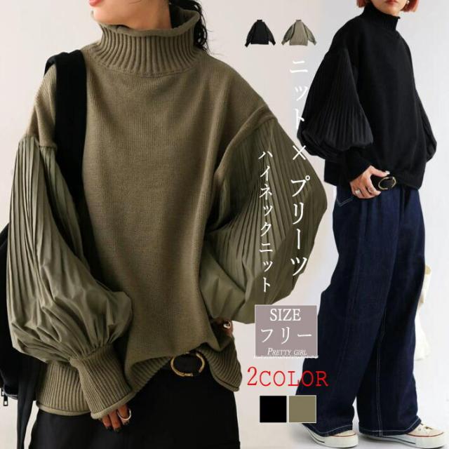 ニット ボリュームスリーブ プリーツ袖 袖コンシャス ハイネック 切り替え セーター ハイネック レディース ドルマン トップス 長袖 ストレッチ 大きめ 体型カバー オーバーサイズ おしゃれ 春 秋 冬