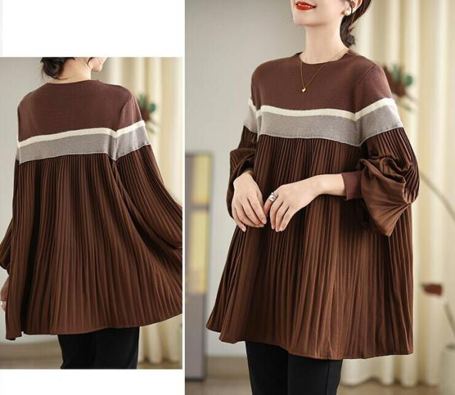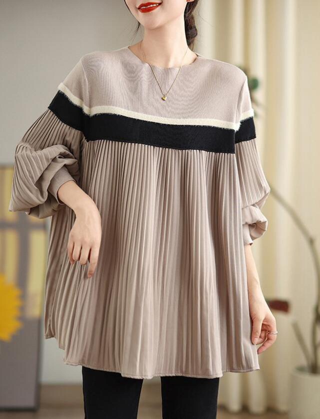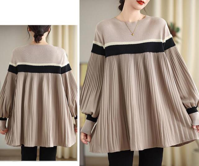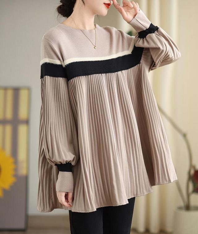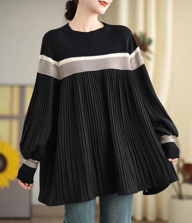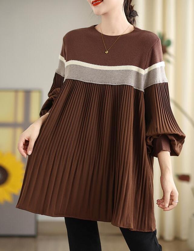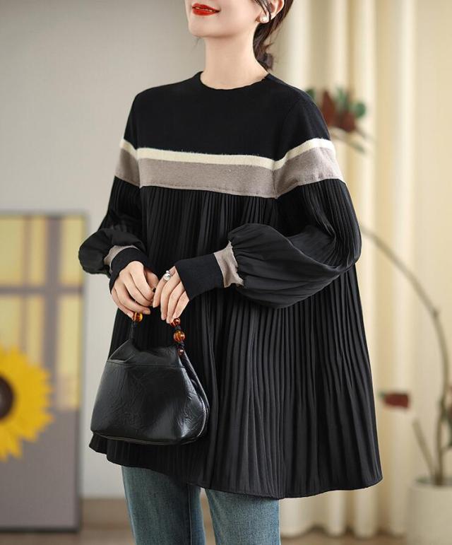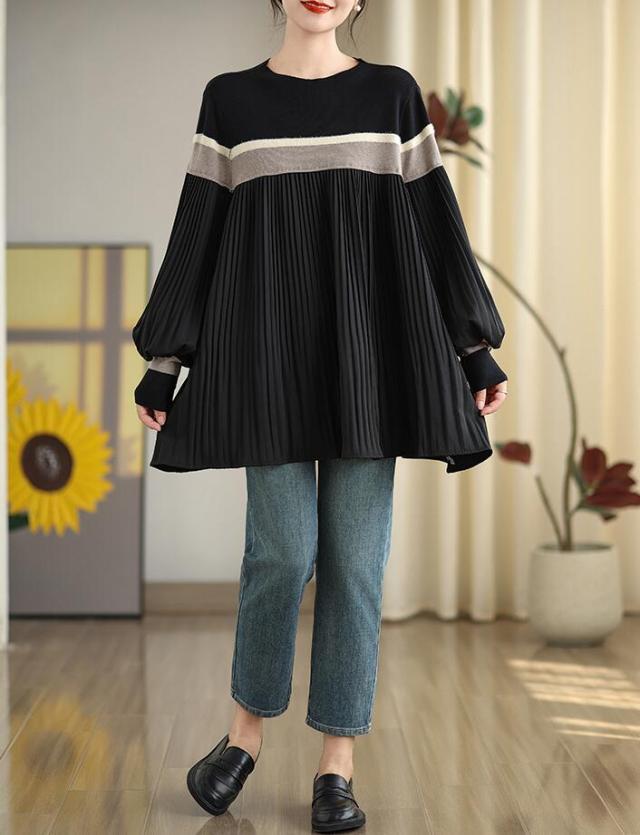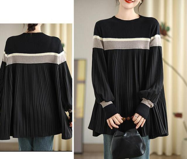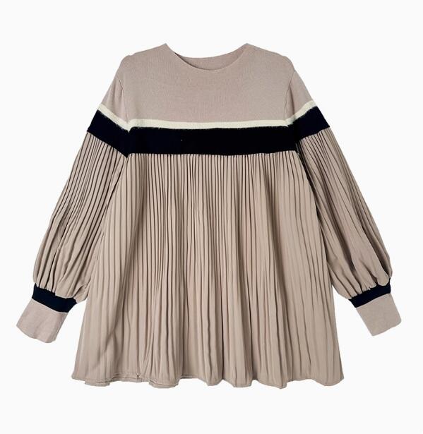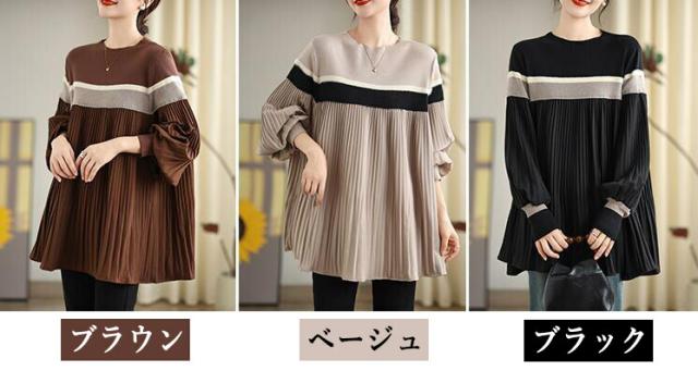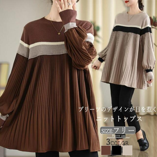ニットチュニック プリーツ ニット セーター クルーネック ボリュームスリーブ 袖コンシャス プルオーバー 袖コンシャス フリル 切替 レディース トップス 長袖 おしゃれ 体型カバー 春 秋 冬