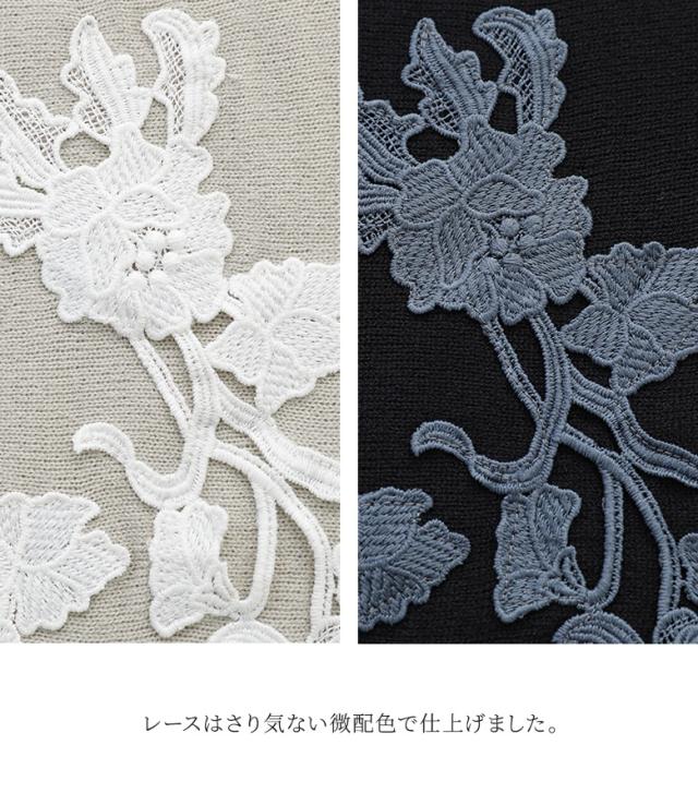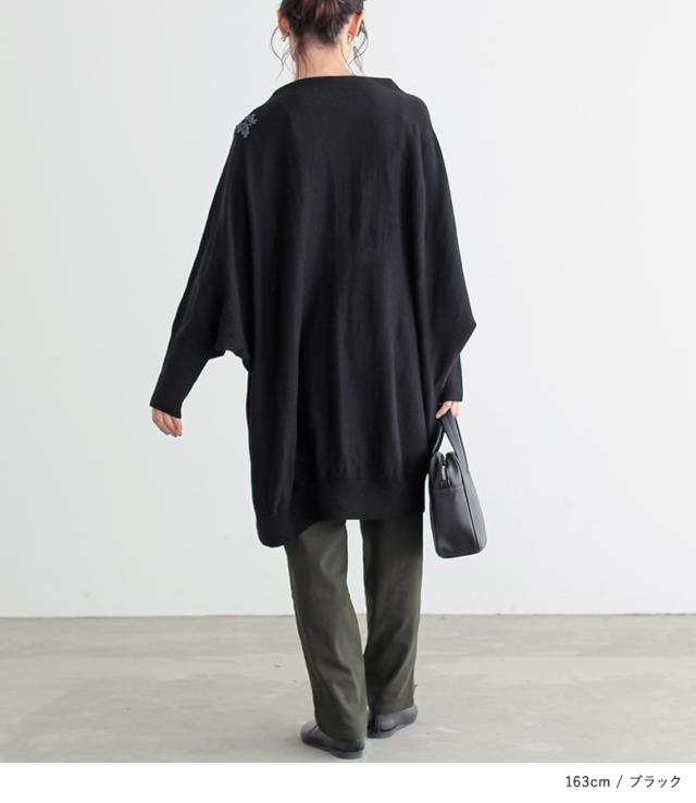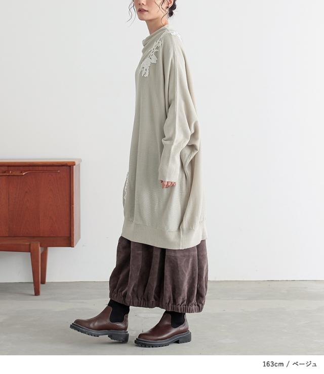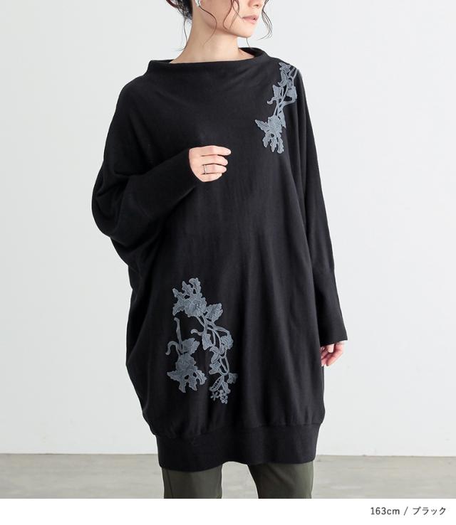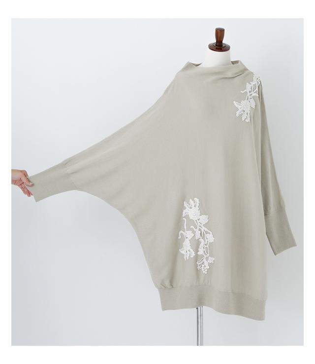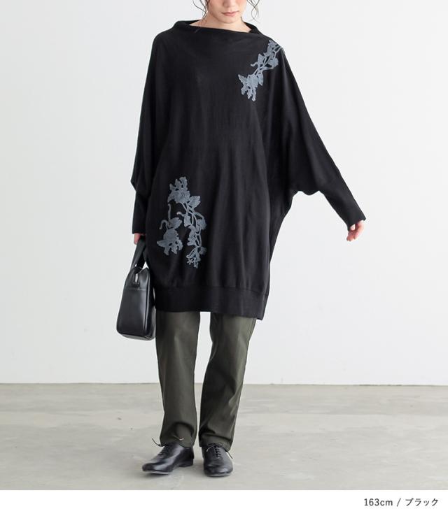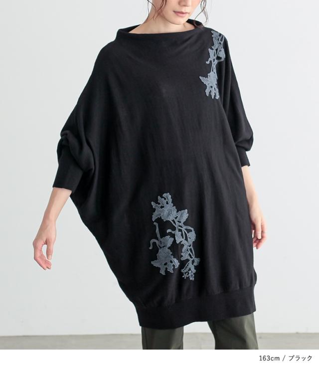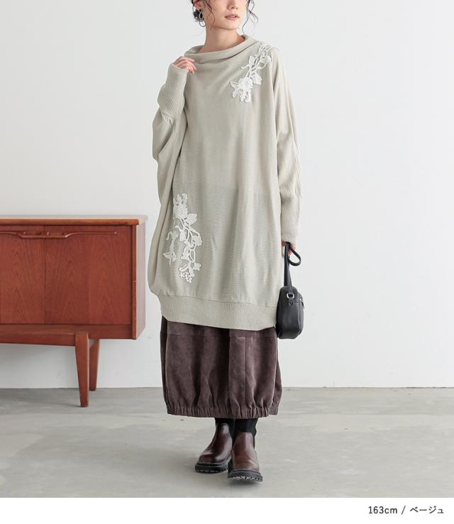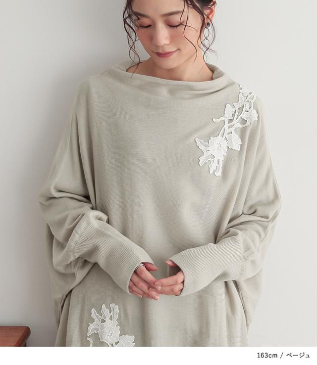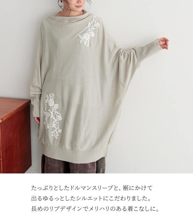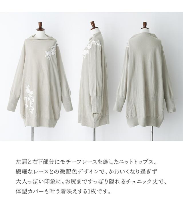 <冬新作>『レースモチーフドルマンチュニックニット』【メール便不可】【30】[ニット 長袖 レディース トップス チュニック セーター ドルマンスリーブ レース 花柄 無地 お尻が隠れる 体型カバー 秋 冬]