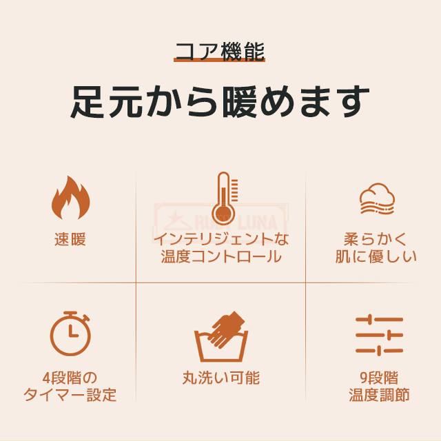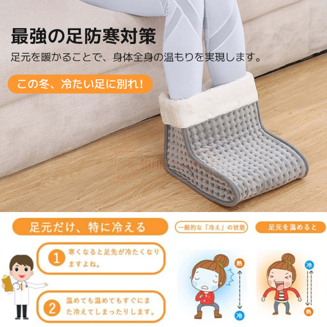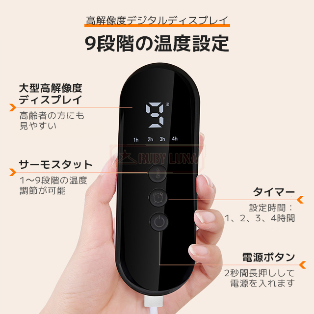 | 【9段階温度調節、4段階タイマー、過熱保護】 | ◆電気足温器は9段階温度調節と4段階タイマー機能が搭載します。1・2・3・4時間切りタイマーと自動OFF機能付きなので消し忘れが心配な人にも時間を決めて使いたい人にも人気があります。外出時などに電源を切り忘れても、安心!また、フットウォーマーには加温度の上がりすぎを防ぐ安全機能付きから、温度が高くなると、高温保護に入って、自動的に停止して、火事の心配はいりません。何度でもお使え、お財布に優しいです。温度調整できるヒーター付きなので自分好みの暖かさに出来ます。 |