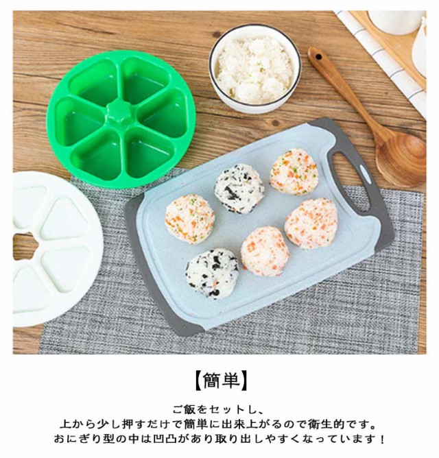 | ご飯を入れてベッと押すだけ! おにぎりメーカー 4色 【時短】 朝の忙しい時間に一度に6個作れるのはとても時短になります。 【同じサイズのおにぎり】 簡単に同じサイズのおにぎりができます! 【簡単】 ご飯をセットし、上から少し押すだけで簡単に出来上がるので衛生的です。おにぎり型の中は凹凸があり取り出しやすくなっています! 【綺麗】 手を汚さずにおにぎりが作れます。海苔も一緒にセット出来るので、手に引っ付かず綺麗に巻けます。 【便利】 一度にたくさん作れるのは便利です。 【使い方いろいろ】 一度にオニギリ沢山作って、冷凍保存も良きです。焼きおにぎりをよく作るようになります。 | |