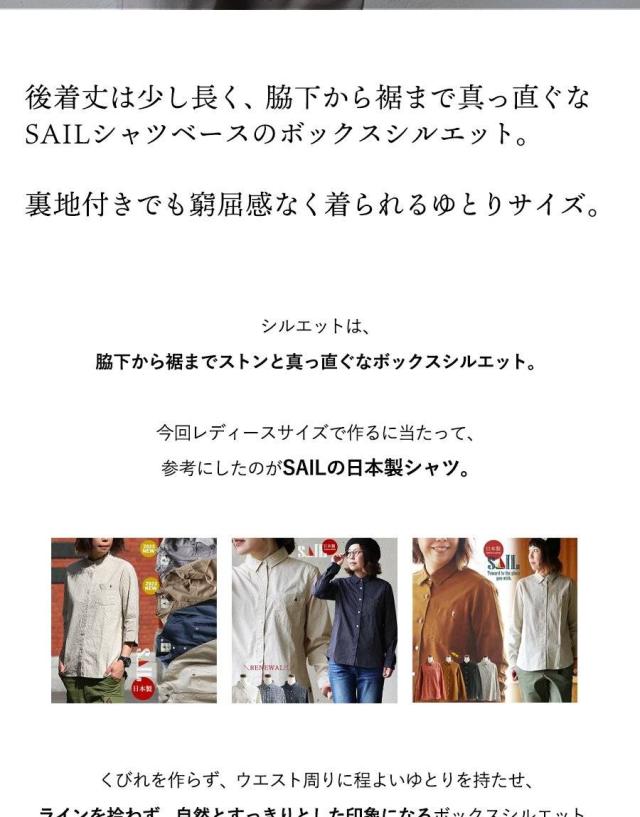 ・後着丈は少し長く、脇下から裾まで真っ直ぐなSAILシャツベースのボックスシルエット。