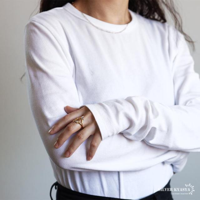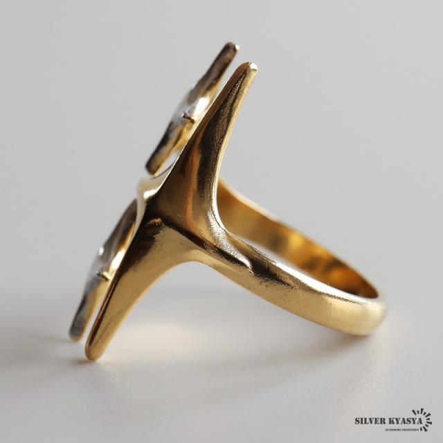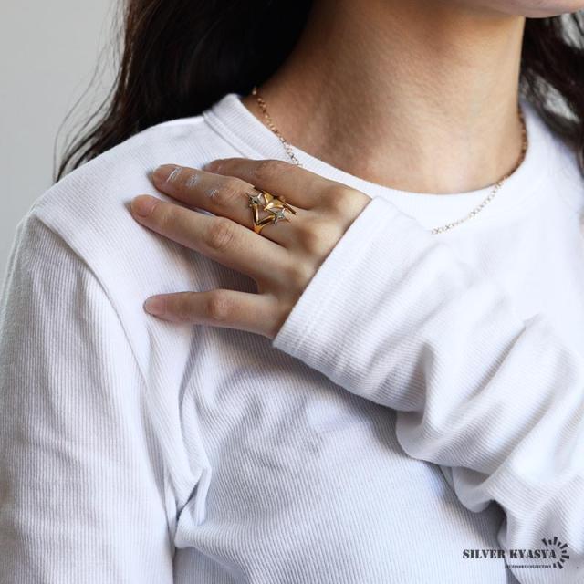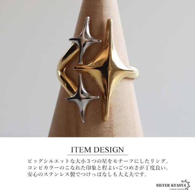 ビッグシルエットな大小3つの星をモチーフにしたリング。コンビカラーのこなれた印象と程よいごつめさが丁度良い。安心のステンレス製でつけっぱなしも大丈夫です。
