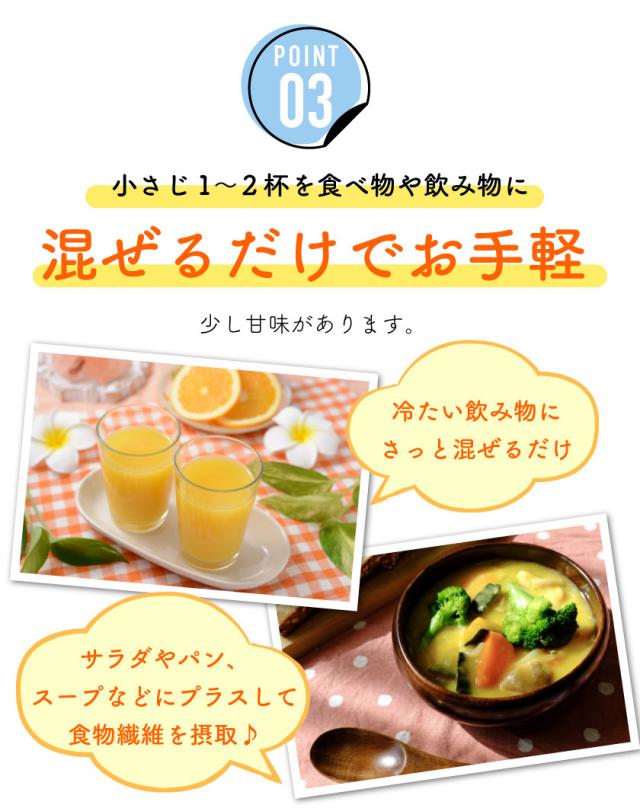 食品として1日小さじ1-2杯(約5-10g)を目安にコーヒー・紅茶などの飲み物や料理などに混ぜてお召し上がりください。少量から始められることをお勧めします。冷たいミルクやジュースでもお使いいただけます。