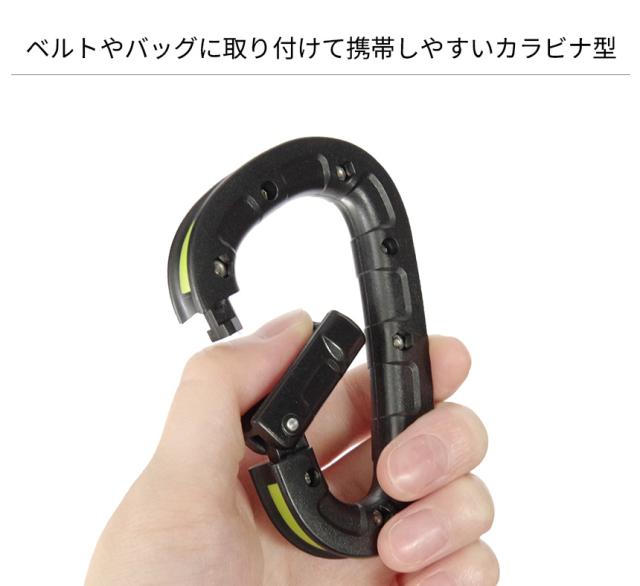 ベルトやバッグなどに直接取り付けて携帯できるカラビナ型!