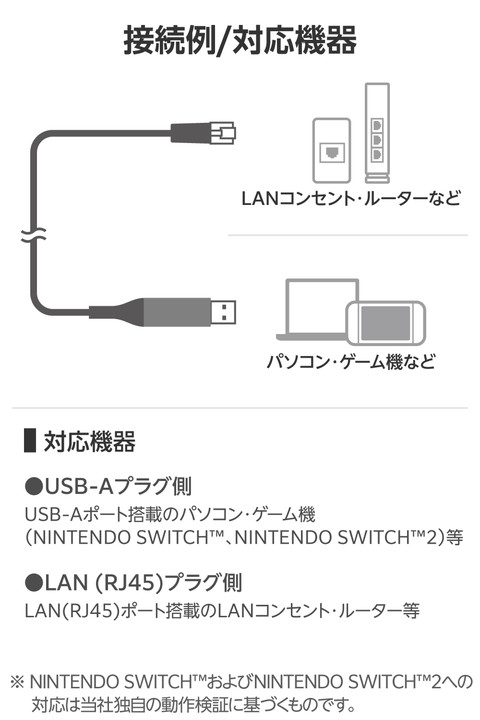 有線接続でネット環境を快適に!有線LANポートがないノートパソコンやゲーム機に接続するだけで、安定した通信ができるUSB-A有線LAN変換ケーブルです。ドライバーのインストールが不要で、高速通信の快適なインターネット環境がこのケーブル1本で実現します。![]() ■有線LANポートがないノートパソコンやNintendo Switch(TM)などのゲーム機に接続するだけで、安定した通信ができるUSB-A有線LAN変換ケーブルです。このケーブル1本でより快適なインターネット環境が手に入ります。 ■最大伝送速度1Gbpsに対応し、大容量データのやり取りも快適な高速通信で安定したインターネット環境を実現します。 ※理論値 ■ドライバーのインストールが不要なので、本製品を機器に接続するだけで有線LAN通信が可能になります。 ■本製品のMACアドレスを変更できるソフト「MACアドレスチェンジャー」(当社ホームページよりダウンロード)を使用することで、オフィスなどのあらかじめ登録されたMACアドレスのみ通信可能な環境でも、本製品を利用可能です。 ※Windowsのみ対応 ■ケーブル長は約2mで、使用範囲を広げるのに便利。取り回しやすい、程よい長さです。 ■EUの「RoHS指令(電気・電子機器に対する特定有害物質の使用制限)」に適合(10物質)した、環境にやさしい製品です。 ■自社環境認定基準を1つ以上満たし、『THINK ECOLOGY』マークを表示した製品です。 ■環境保全に取り組み、製品の包装容器が紙・ダンボール・ポリ袋のみで構成されている製品です。 ![]() ■コネクター形状1:USB-Aプラグ ■コネクター形状2:RJ45プラグ ■規格:Cat6(1000BASE-TX/1000BASE-T/100BASE-TX/10BASE-T) ■伝送速度:最大1Gbps ※理論値 ■伝送帯域:250MHz ■対応プロトコル:IPv4/IPv6 ■定格入力:5V/900mA ■導体構成:ヨリ線(32AWG) ■シールド:○(STP仕様) ■結線方式:ストレート結線 ■PoE:× ■対応ソフト:MACアドレスチェンジャー ■外形寸法:幅約16mm×奥行約75mm×高さ約6mm(USB-Aプラグ部) ■ケーブルタイプ:ノーマルタイプ ■ケーブル長:約2m ※コネクター含まず ■ケーブル太さ:約4.2mm ■カラー:ブラック ■パッケージ形態:紙箱 ■環境配慮事項:EU RoHS指令適合(10物質)、THINK ECOLOGYマーク |