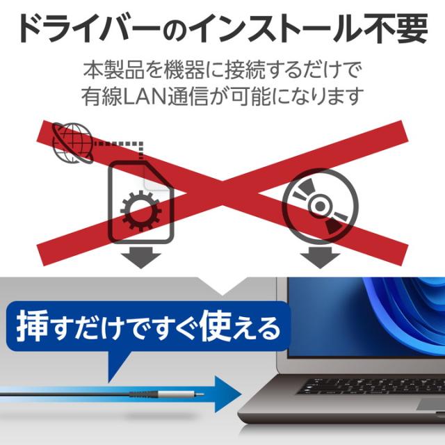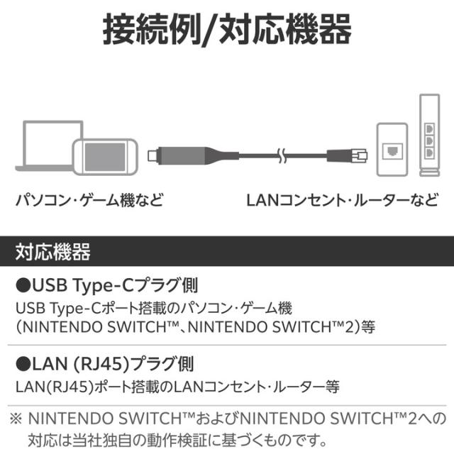 有線接続でネット環境を快適に!有線LANポートがないUSB Type-C(TM)ポート搭載のノートパソコンやゲーム機に接続するだけで、安定した通信ができるUSB Type-C有線LAN変換ケーブルです。ドライバーのインストールが不要で、高速通信の快適なインターネット環境がこのケーブル1本で実現します。