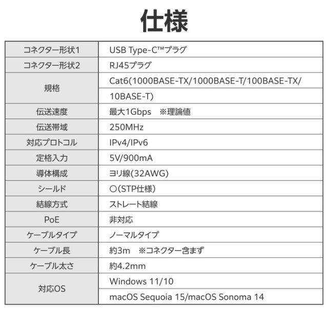 有線接続でネット環境を快適に!有線LANポートがないUSB Type-C(TM)ポート搭載のノートパソコンやゲーム機に接続するだけで、安定した通信ができるUSB Type-C有線LAN変換ケーブルです。ドライバーのインストールが不要で、高速通信の快適なインターネット環境がこのケーブル1本で実現します。![]() ■有線LANポートがないUSB Type-C(TM)ポート搭載のノートパソコンや、Nintendo Switch(TM)などのゲーム機に接続するだけで、安定した通信ができるUSB Type-C有線LAN変換ケーブルです。このケーブル1本でより快適なインターネット環境が手に入ります。 ■最大伝送速度1Gbpsに対応し、大容量データのやり取りも快適な高速通信で安定したインターネット環境を実現します。 ※理論値 ■ドライバーのインストールが不要なので、本製品を機器に接続するだけで有線LAN通信が可能になります。 ■本製品のMACアドレスを変更できるソフト「MACアドレスチェンジャー」(当社ホームページよりダウンロード)を使用することで、オフィスなどのあらかじめ登録されたMACアドレスのみ通信可能な環境でも、本製品を利用可能です。 ※Windowsのみ対応 ■ケーブル長は約3mで、離れた場所にも届き、レイアウトの自由度が高まります。 ■※USB Type-C and USB-C are trademarks of USB Implementers Forum. ■EUの「RoHS指令(電気・電子機器に対する特定有害物質の使用制限)」に適合(10物質)した、環境にやさしい製品です。 ■自社環境認定基準を1つ以上満たし、『THINK ECOLOGY』マークを表示した製品です。 ■環境保全に取り組み、製品の包装容器が紙・ダンボール・ポリ袋のみで構成されている製品です。 ![]() ■コネクター形状1:USB Type-C(TM)プラグ ■コネクター形状2:RJ45プラグ ■規格:Cat6(1000BASE-TX/1000BASE-T/100BASE-TX/10BASE-T) ■伝送速度:最大1Gbps ※理論値 ■伝送帯域:250MHz ■対応プロトコル:IPv4/IPv6 ■定格入力:5V/900mA ■導体構成:ヨリ線(32AWG) ■シールド:○(STP仕様) ■結線方式:ストレート結線 ■PoE:× ■対応ソフト:MACアドレスチェンジャー ■外形寸法:幅約16mm×奥行約75mm×高さ約6mm(USB Type-Cプラグ部) ■ケーブルタイプ:ノーマルタイプ ■ケーブル長:約3m ※コネクター含まず ■ケーブル太さ:約4.2mm ■カラー:ブラック ■パッケージ形態:紙箱 ■環境配慮事項:EU RoHS指令適合(10物質)、THINK ECOLOGYマーク |