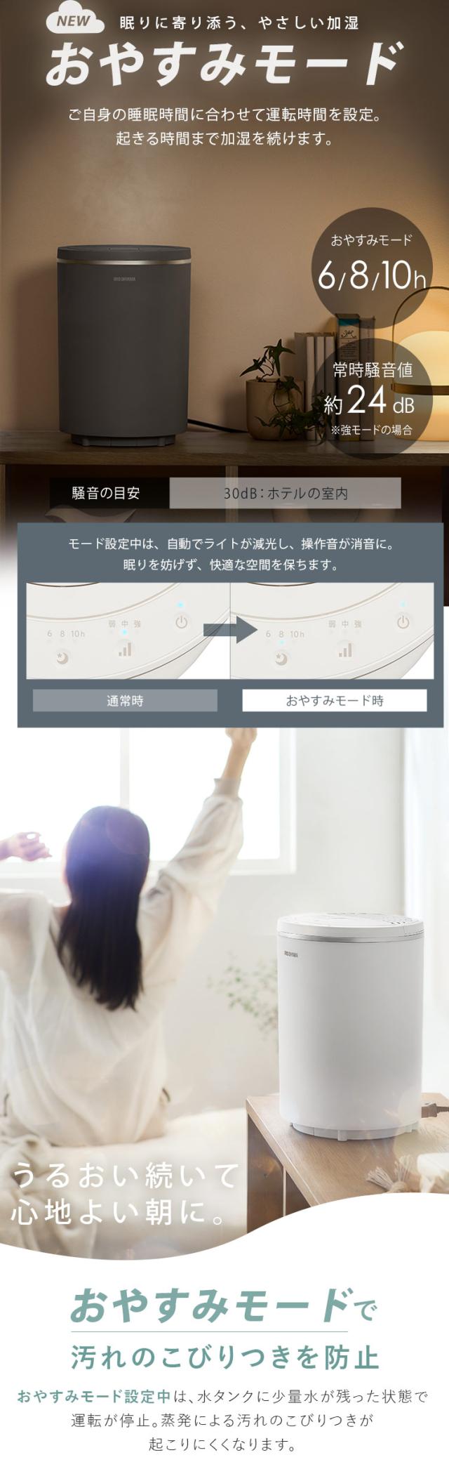 また「おやすみモード」設定中は、水タンクに少量水が残った状態で運転停止するため、完全蒸発による汚れのこびりつきが起こりにくくなります。