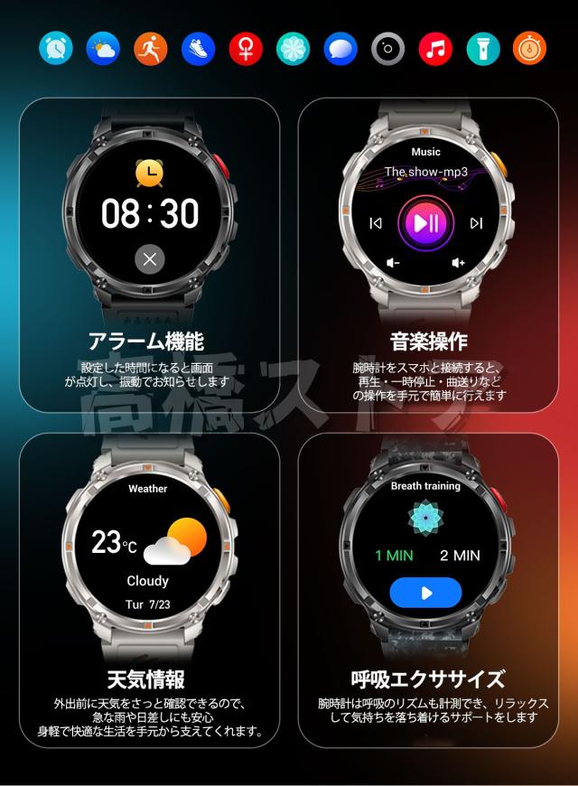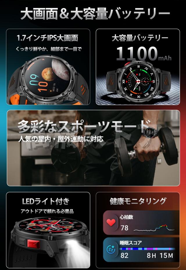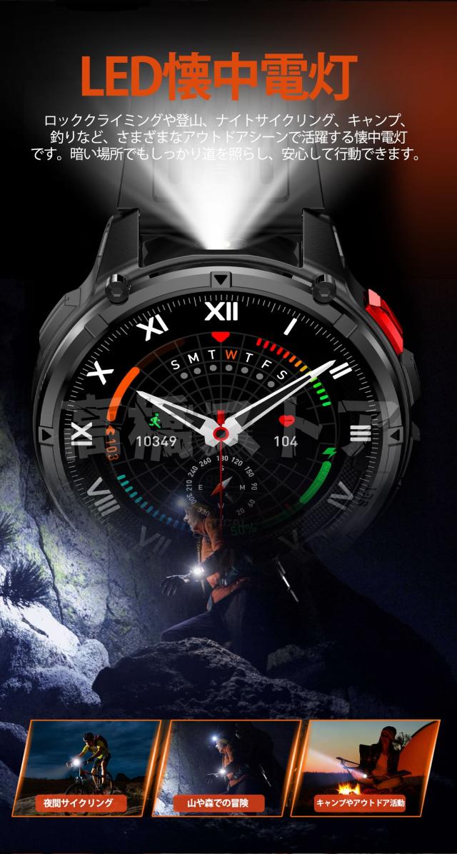 スマートウォッチ 懐中電灯 丸型 長持ち 1100mAhバッテリー 大画面 1.7インチ iphone対応 アンドロイド対応 防水 歩数計 GPS おしゃれ 通話機能付き 着信通知 腕時計 健康管理 心拍数 血中酸素度 防塵 メンズ レディース 2026