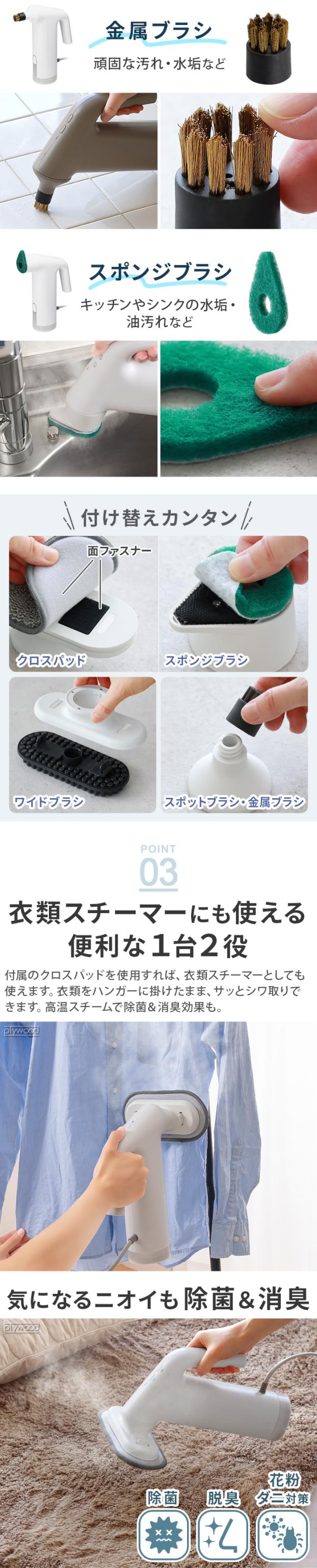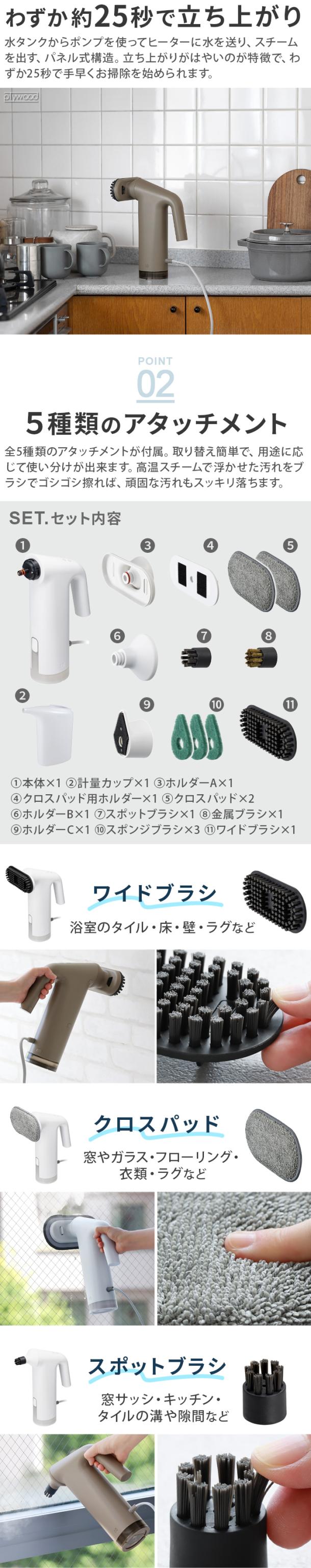 ブラマイゼロからスリムで操作性に優れたハンディータイプのスチームクリーナーが登場です。高温のスチームと付属のアタッチメントブラシで、溜まった 汚れを浮かせて擦って落とします。全5種類のアタッチメント付きで、キッチンや浴室、洗面台、床や壁まで、1台で家中まるごとお掃除できます。お掃除の他にも、衣類スチーマーとしても使用可能な優れものです。※ブラシ回転機能は付いていません。
