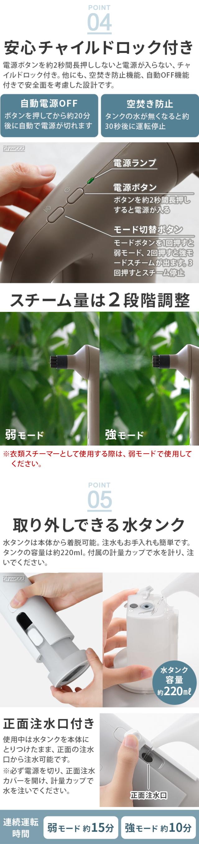 | この商品は、海外ではご使用になれません。 掃除に使用する場合は、やけどを防止するためゴム手袋の着用をおすすめします。 ブラシの回転機能はありません。 色落ちするものや、熱に弱い素材、デリケートな素材、高価なものへのご使用は避けてください。 素材によっては傷が付く恐れがあります。目立たない箇所で試してからご使用ください。 スチーム吹出口付近は高温になるため触れないでください。 使い始めや長時間の放置後に使用を再開する場合、ホースや内部にたまっていた水がスチーム(熱い飛沫含む)が出る場合があります。ご注意ください。 入荷前に生産工場で水を入れて検査をしています。まれに内部に水分が残っていることがあり、電源を入れた際にスチーム(熱い飛沫含む)になって飛び出てくることがあります。ご注意ください。 本製品は水道水を使用する設計になっています。水道水以外の水、洗剤などの液体を入れないでください。 注水するときは必ず電源を切ってください。 衣類スチーマーとして使用する際は、衣類に表示されている取扱絵表示を確認し、説明書の表示にしたがってスチームをかけてください。「スチーム禁止」の表示がある場合は使用しないでください。 初めてスチームをかける衣類は目立たない部分で試してからご使用ください。 ブラシの汚れがひどい時は、台所用中性洗剤で出荒いし、よくすすぎ、しっかりと乾燥させてください。※食洗器や煮沸消毒は不可 |
