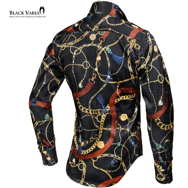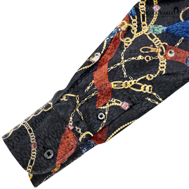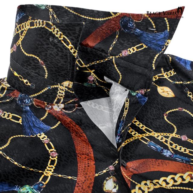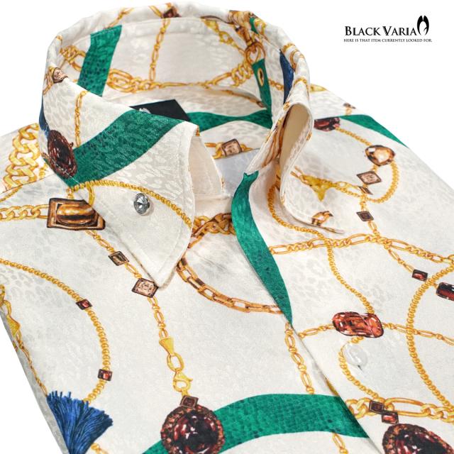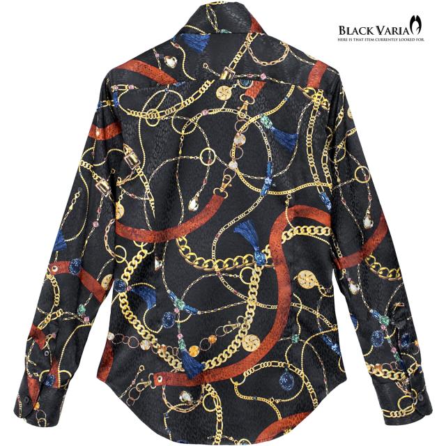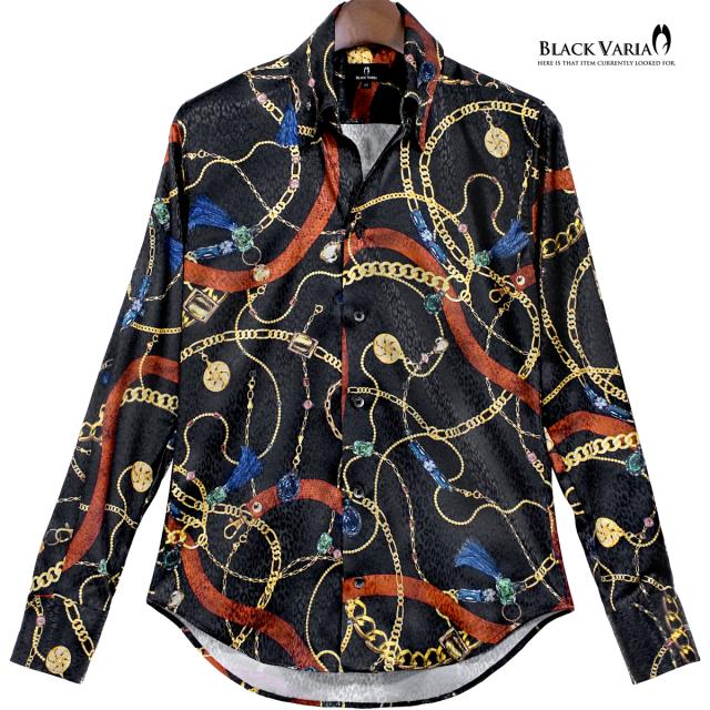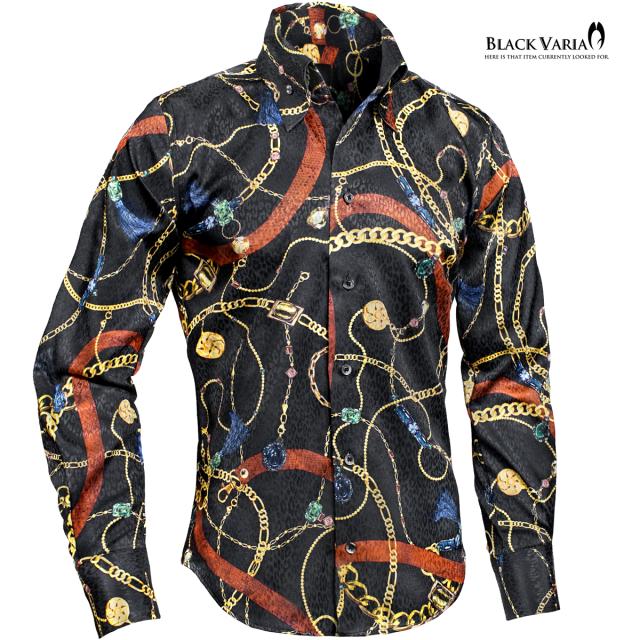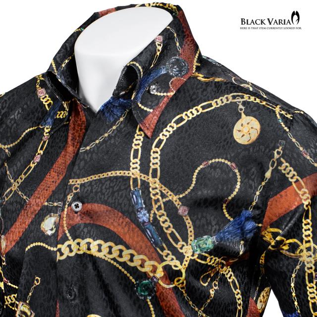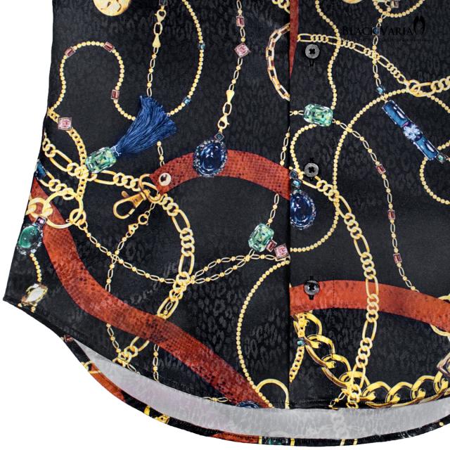 BLACK VARIA サテンシャツ ドレスシャツ スキッパー チェーン柄 宝石 鎖 ジャガード ボタンダウン 日本製 メンズ(ブラック黒) 251106