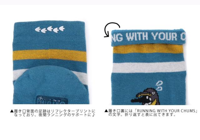 スケーターソックスのようなルックスに、ランニングに最適な機能をプラスしたソックス。足の甲部分にはランニング中のブービーバードを編みで表現し、履き口には「RUNNING WITH YOUR CHUMS」の文字をデザイン。折り返して履くこともでき、スタイリングの幅が広がります。背面にはブービーバードの足跡のリフレクタープリントをあしらい、夜間のランニングの視認性をサポートします。