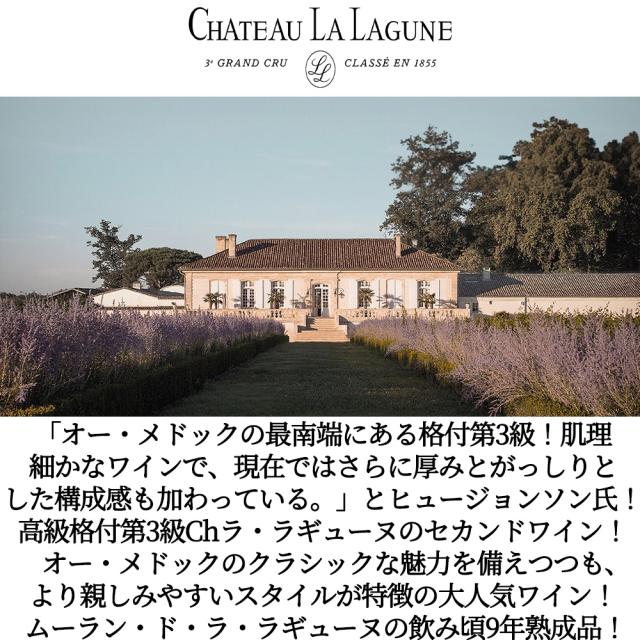 「オー・メドックの最南端にある格付第3級!肌理細かなワインで、現在ではさらに厚みとがっしりとした構成感も加わっている。」とヒュージョンソン氏!高級格付第3級Chラ・ラギューヌのセカンドワイン! オー・メドックのクラシックな魅力を備えつつも、より親しみやすいスタイルが特徴の大人気ワイン! ムーラン・ド・ラ・ラギューヌの飲み頃9年熟成品!