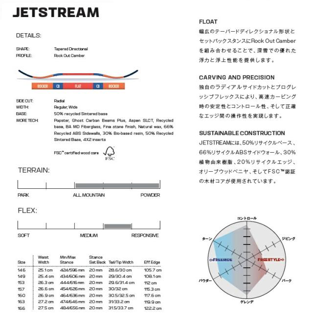 JETSTREAMは、どんなコンディションでも日常使いに適した、個性豊かで操作性に優れたフリーライドボードです。 R o c k O u t C a m b e rとテーパードディレクショナル形状を備えたこのボードは、ナイフのように鋭くカーブし、夢のような浮力を発揮します。 さらに、進化したフレックスと洗練されたラディアルサイドカットにより、エッジからエッジへの移行が驚くほどスピーディです。