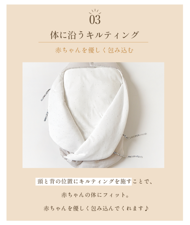 また、頭と背の位置にキルティングを施すことで赤ちゃんの体にフィットし やさしく包み込んでくれます。