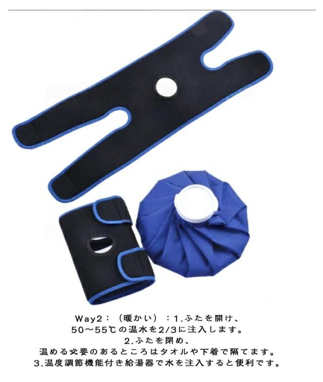 | 膝サポーター 氷嚢(氷のう)付き 【圧迫力の調整がしやすい】調節がしやすいマジックテープ設計で体型にフィットしやすいです。あらゆるスポーツのトレーニングや競技後のクールダウンに!! 【対応部位】 ヒジ・ヒザ・太もも・足首・手首などに 【保冷/保温両用の氷嚢(氷のう)付き】保冷効果を逃がさず、長時間のアイシングが可能です。ホットバック55℃以下のお湯を用いて、温熱アイスバッグにもお使いいただけます。 【水漏れ防止】アイスバッグの裏に高品質なポリウレタンコーティング加工され、キャップがしっかり密封で、水漏れがありません。それに、表に結露と水滴が生じにくく防湿加工で、結露もなくて、楽しく使えます。 【使用方法】Way1:(冷たい)1.ふたを開け、少量の水を入れてアイスキューブを入れます。アイスパックの容量の1/2から2/3が氷の体積です。 2.水が漏れないようにふたをしっかりと閉めます。 3.アイスパックを冷やす必要のあるところに置き、包帯または特別な保護具で固定します。 Way2:(暖かい):1.ふたを開け、50?55℃の温水を2/3に注入します。 2.ふたを閉め、温める必要のあるところはタオルや下着で隔てます。 3.温度調節機能付き給湯器で水を注入すると便利です。 | |