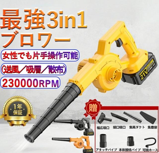 【2026年新発売3in1】ブロワー 洗車 充電式ブロワー 超強力 ジェットドライブロワー 電動 エアダスター コードレス ブロアー 小型 軽量 電気エアダスター ターボジェットファン 230000rpm 高速回転 21V互換対応 ハンディー 小型ミニ 暴風 大掃除 洗車後の水滴吹き飛ばし充電式 コードレス ブロアー ハイパワー 18V バッテリー リチウムイオン 対応 最大230000RPMの風力が提供 ブロアー 充電式ブロワー 電動工具 キーボード 速回転 高耐損性 耐性【革新的高風速デザイン】 高速力モーターを搭載し、力強いジェットファンを提供します。最大風量は1分間に3立方メートルに達し、抜群の空気循環能力を持ち、効率を兼ね備えた空気フローを確立。組み込まれた丈夫なブラシレスモーターは、最大230000rpmの高速回転を実現し、安定した強風を常に提供します。弱い風にさよなら、革新的な乾燥体験。【軽量で持ち運びが便利】この充電式ブロワーは、わずか900gという軽量な設計でありながら、高いパフォーマンスを提供します。軽量であるため、片手で簡単に操作でき、持ち運びに便利です。滑り止め設計のハンドルは、快適な握り心地を提供し、長時間の作業でも手首や手に負担をかけません。最大風量は1分間に3立方メートルに達し、室内のほこりや屋外の落ち葉を迅速かつ効果的に除去します。このブロワーは、持ち運びや操作の面で利便性を追求し、ユーザーに快適な作業体験を提供します。【多機能設計と強力な吸引】この充電式ブロワーは、風と吸引機能を組み合わせた多機能設計を採用しています。強力な風で落ち葉や水滴を迅速かつ効果的に除去するだけでなく、付属のダストバッグを使用することで、ベッド下や車内の細かい汚れも軽々と集めます。また、延長管を取り付ければ、ノズルの長さを延ばし、清掃範囲を広げることができます。さらに、ブロワー耐久性の高い構造設計により、長期間の使用でもパフォーマンスを維持し、信頼性の高い作業を実現します。【銅製モーターと信頼性】高品質な銅製モーターを搭載したこの充電式ブロワーは、安定したパフォーマンスと信頼性を提供します。ブロワーの最大風量は1分間に3立方メートルに達し、強力な吹き出しを実現します。銅製モーターの高い効率性は、機械の寿命を延ばし、持続的で信頼性のある作業を実現します。【充実した付属品と高品質なサービス】この充電式ブロワーには、多彩な付属品が付属しており、さまざまな作業に対応します。この充電式ブロワーの付属品は非常に充実しており、本体、接続アダプタ×1、充電器(別途購入)、バッテリー(別途購入)、延長管×1、ナローノズル×1、ワイドノズル×1、集塵袋×1などが含まれています。豊富なアクセサリーが付属しており、ユーザーに便利な作業環境を提供します。また、高品質なアフターサービスを提供し、ユーザーが安心して使用できるようサポートします。【洗車など様々な用途】 このブロワー エアダスターは、洗車の拭き上げ、車内のゴミやホコリ飛ばし、除雪、キーボードの掃除、庭の掃除、マットのゴミの除去、扇風機代わり、ペットの入浴後の乾燥、炭火起こしなどさまざまなお掃除の場面で幅広く活躍できます。【品質保証安心】 出荷前に厳格な品質検査が行われておりますが、万が一、お手元に届いた商品に欠陥があるか、使用中に疑問がある場合は、「注文履歴」→「出品者に連絡する」で弊社ショップにご連絡ください。担当者は24時間以内に返信し、真摯にご対応させて頂きます。5