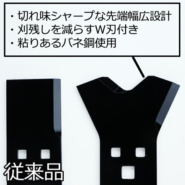 ●刃の磨耗面積が広く経済的な【先端幅広刃】 (刃の上部V字刃の半分が磨耗したら反転させて両側を使用可能。) ●軽快な切れ味の【切削刃付け】 ●刈残しを減らす【W刃形状】 ●材質はねばりある【最高級バネ鋼】 だから従来品とは耐磨耗性が違います。 【サイズ】 長さ145mm×70mm巾(最大先巾130mm)×6mm厚 穴径 中央大穴…約16mm 左右小穴…約11mm ※5セット10枚とボルトセット10組(5台分)の価格です。 ※適合機種一覧に記載がございましても、取付部分がボルトではなく、カギ式のものにはお使いいただけません。 ボルトは耐磨耗性を向上させるため焼入れを施した肉厚頭で、ナットはハードロックナットM14です。 各メーカーのカラーも別売りであります。 |