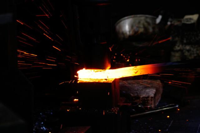 | 赤めた極軟鉄の中心を裂き青紙鋼を割り込みます。ハンマーにて手際良く叩き、ナタの形がすばやく出来上がります。 優れた伝統技を持った職人が精魂を込めて造った手作りの刃物には、 はがね割り込み鍛接・火造り品です。複合材を軽く叩いた物とは切れ味の世界が違います。 | |