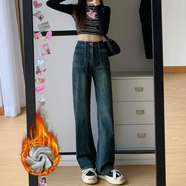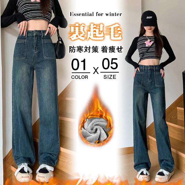 デニムパンツ ジーンズ レディース 裏ボア 裏起毛 ワイドパンツ ハイウエスト ジーパン ロング 体型カバー ボトムス ズボン 防風 着痩せ
