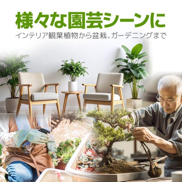 室内インテリアでの観葉植物、多肉植物をはじめ、盆栽やプランター、ガーデニングなど幅広い園芸で役立ちます。