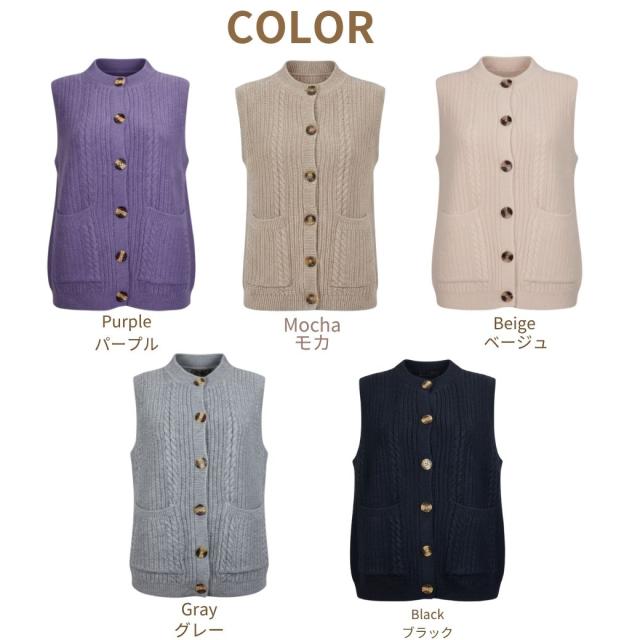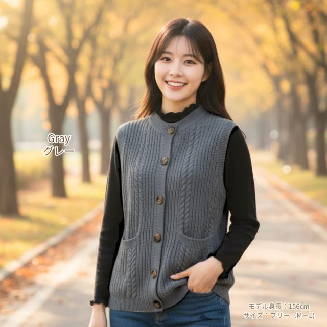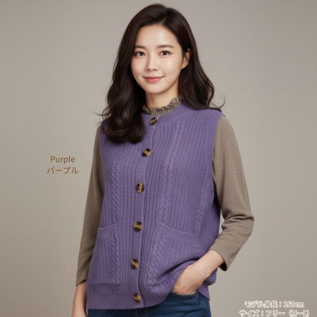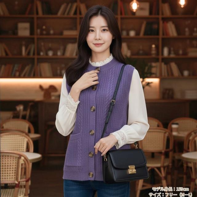 【カラー】ブラック グレー ベージュ モカ パープル 【サイズ】フリーサイズ (M-L) 着丈 58 バスト 96 身長 154-162 肩幅 36 単位 (cm) ※製造工程の関係上、各個所に±2cmほどの誤差があります。 ※上記のサイズはスタッフ計測による平置き実寸サイズです。 ※商品タグ等の表記サイズ値とは異なります。 【洗濯表示】 手洗い 【素材】 レーヨン50%ポリエステル35%ナイロン15% 【生地感】 伸縮性: 非常にあり 【生地の厚さ】 4 (※5段階中。5が最も厚い)厚みがあり暖かい 【シーズン】 秋‐冬 【特徴】 商品の魅力とコンセプト:おしゃれを諦めない大人の女性へ 【さっと重ねるだけで高見え!体型カバーも叶う大人のためのケーブル編みベスト】 「いつもの服に飽きたけれど、どんな服を選べばいいか分からない」「おしゃれを楽しみたいけれど、体型が気になる」——そんな大人の女性のお悩みに寄り添うのが、この立体ケーブル編みニットベストです。 さっと重ねるだけで、まるで雑誌から飛び出したような上品で旬なレイヤードスタイルが即完成!年齢を重ねても変わらない**「おしゃれを楽しみたい」という気持ちを応援します。ご旅行やお孫さんとの外出、同窓会など、様々なシーンで「素敵ね」**と褒められるコーディネートを叶えます。 2. シニア層に嬉しいデザインと機能性:安心感と快適さを追求 ■ 絶妙な丈感とゆったりシルエットで、気になる部分を徹底カバー 大人の女性が一番気になるお腹周りやヒップラインをしっかりカバーできるよう、着丈と身幅にこだわったゆったりシルエットを採用しました。 気になる体型をカバー: ヒップを優しく包み込む安心の丈感で、後ろ姿まで抜かりなくカバー。かがんだり立ったりする動作も気になりません。 締め付け感なし: 袖ぐりや身幅はゆとりを持たせているので、厚手のインナーの上からでも楽に重ね着でき、一日中快適に過ごせます。 着脱しやすい前開きボタン: 首元から裾まで続く前開きボタンデザインは、脱ぎ着が簡単で、体温調節がしやすいのもシニア世代に嬉しいポイントです。 ■ 合わせやすいデザインと実用性 高見えケーブル編み: 立体感のある表情豊かなケーブル編みが、無地のインナーに華を添え、高級感を演出します。縦のラインが強調されることで、すっきり細見え効果も期待できます。 実用的なポケット: 両脇には、ハンカチやスマートフォン(スマートフォンは入らない場合もございます)、鍵など、ちょっとした小物を入れるのに便利なポケットを配置しました。 3. 着回し提案:お手持ちのアイテムが生まれ変わる お手持ちのアイテムにプラスするだけで、新鮮な着こなしが楽しめる着回し力抜群の一着です。 【お出かけ・普段着に】 ブラウスやシャツと重ねて、パールネックレスやブローチを添えれば、上品で華やかなスタイルに。 ハイネックやタートルネックと合わせれば、首元も暖かく、秋冬の防寒対策にも。 【季節の変わり目、冷房対策に】 Tシャツやカットソーの上に羽織れば、冷房の効いた室内での寒さ対策や、朝晩の肌寒い時間帯に重宝します。 【ボトムスを選ばない】 ワイドパンツでリラックス感のあるお洒落に、スカートで女性らしく、チュニックとの重ね着でもバランスよくまとまります。 注意事項 ■商品の撮影には最大限注意を払っておりますが、閲覧時のモニター環境によりましては実際の商品と若干違うお色味に映ることもございます。