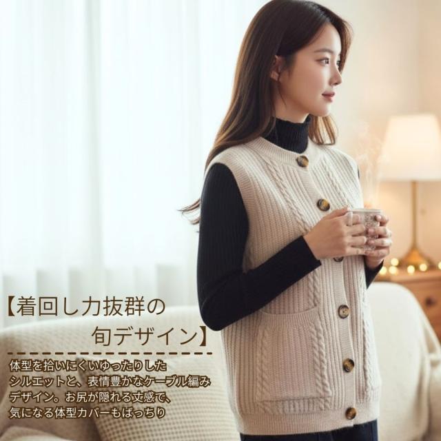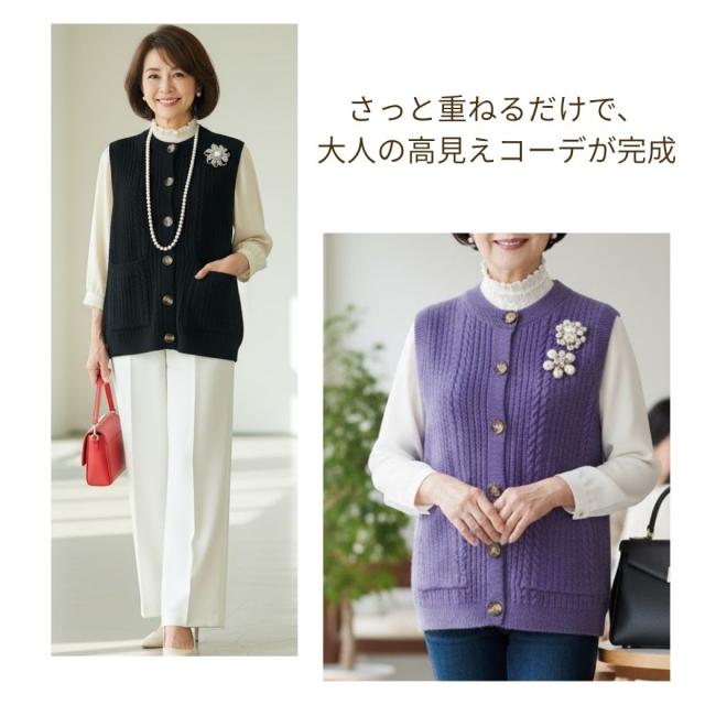 【さっと重ねるだけで高見え!体型カバーも叶う大人のためのケーブル編みベスト】