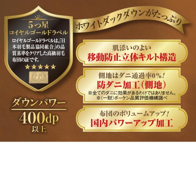 ロイヤルゴールドラベル取得で品質は保証済み。ポーランド産ホワイトダックダウンを贅沢に90%も使用したお買い得羽毛布団に、さらに贅沢な寝心地の増量タイプもご用意しました!ロイヤルゴールドラベルは、「日本羽毛製品協同組合」の品質基準をクリアした高級羽毛布団の証です。