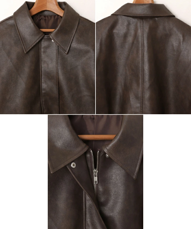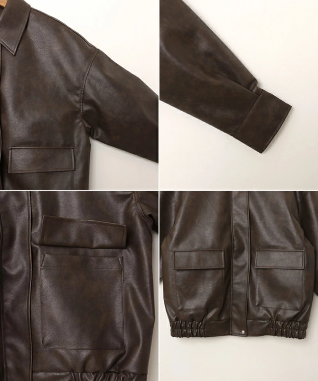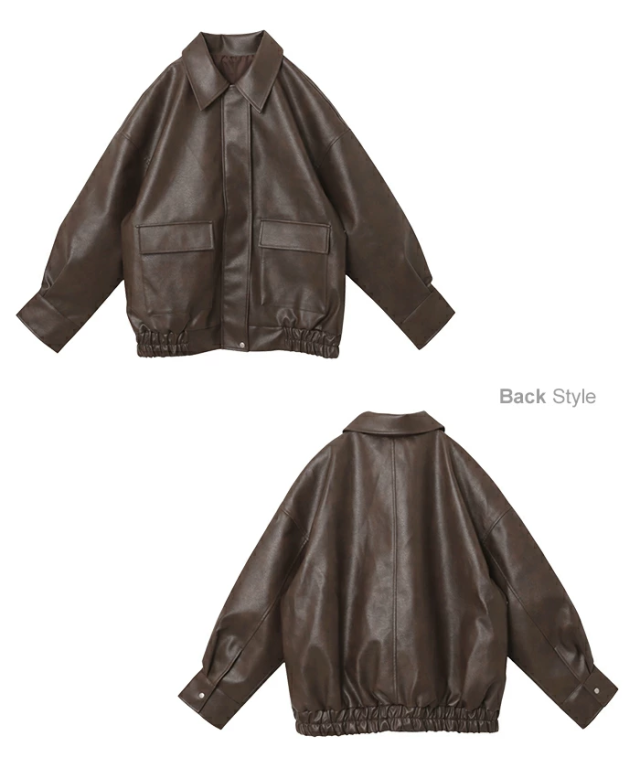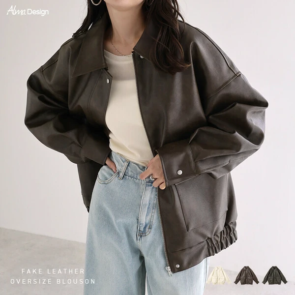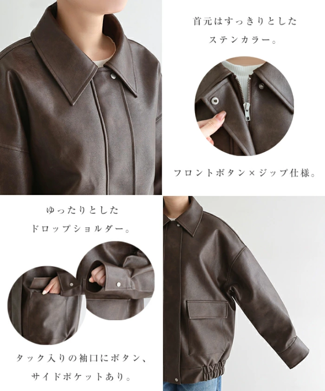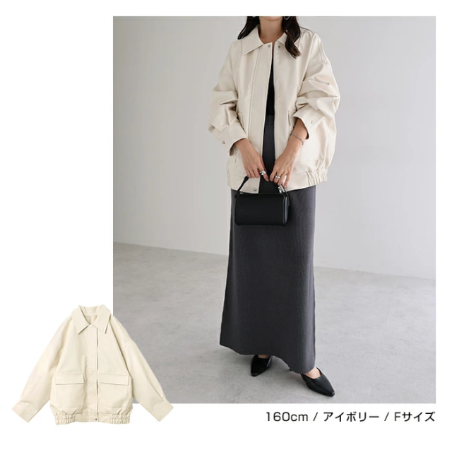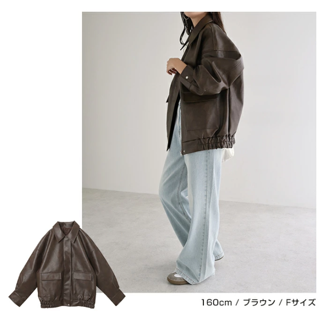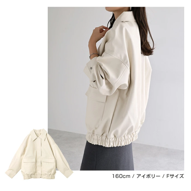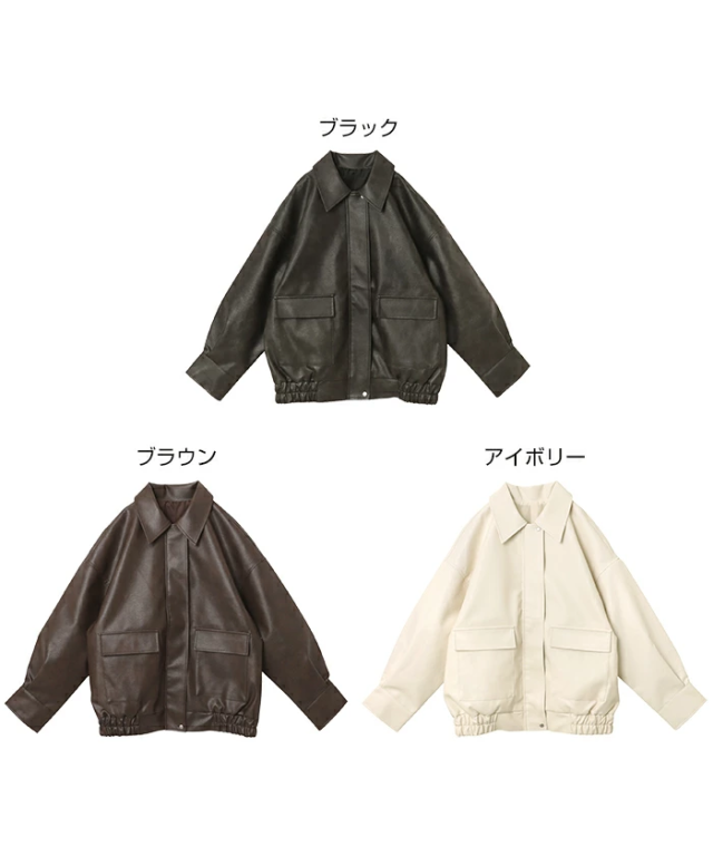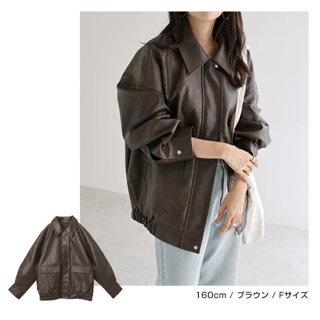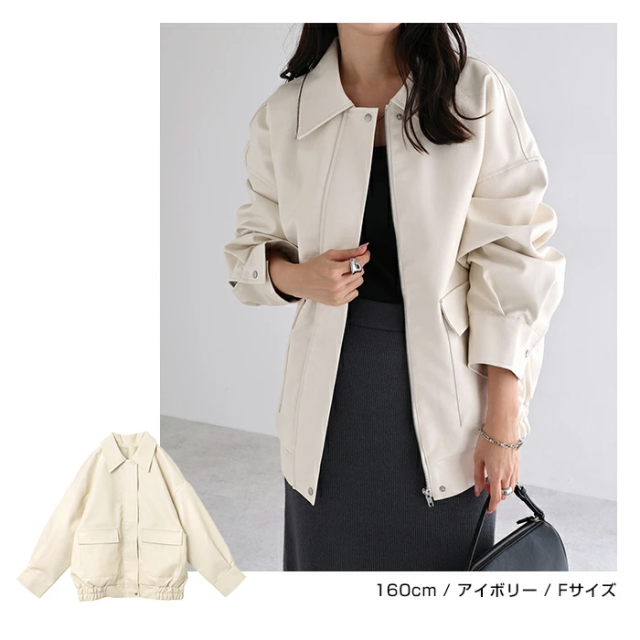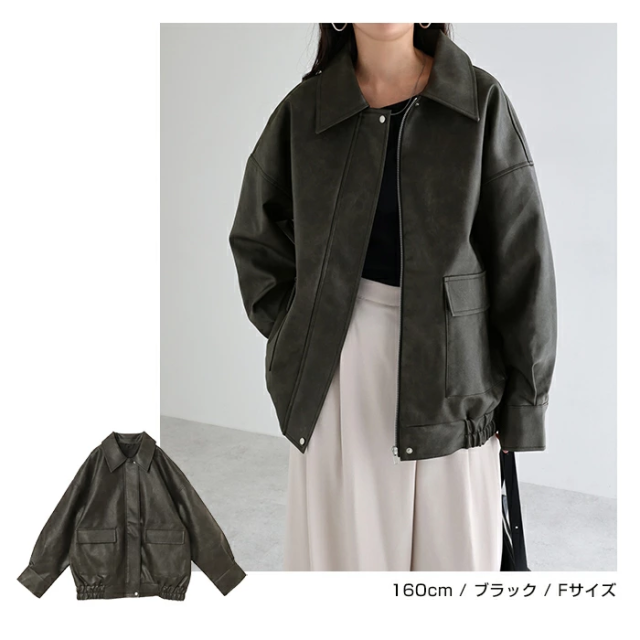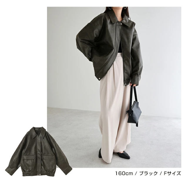 t04 フェイクレザー オーバーサイズ ブルゾン レディース アウター レザーブルゾン ジャンパー コート 羽織り 体型カバー ゆったり 楽ちん ステンカラー タック ポケット 裏地付き ボリューム袖 長袖 ミドル丈 カジュアル トレンド 秋服 冬服 あったか 暖か 防寒 秋冬